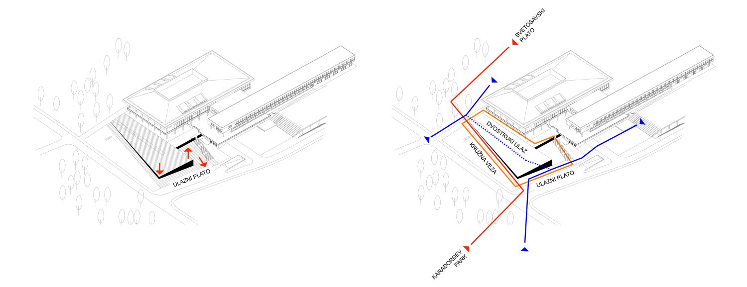 Ulazni plato i pešačke površine su tako pozicionirane da omogućavaju kružnu vezu Svetosavskog platoa, Narodne biblioteke, ulaznog platoa nove Galerije, i Karađorđevog parka. Pristup Galeriji je dvojni, tako da i ona zadržava karakter vibrantne prometne zone grada – glavni pristup je sa platoa iz Skerlićeve ulice, dok je sa strane Svetosavskog platoa omogućen direktan pristup dugačkom rampom koja se spušta ispod nivoa tla, otkrivajući obrise skrivenih prostora Galerije. Oba prilaza susreću se u ulaznom holu, odakle je početna tačka obilaska izlagačkog prostora. Ulazni plato je delom zakošen ka Biblioteci, tako da formira zonu neformalnog sedenja u javnom prostoru grada, i specifičan prostor okupljanja prilikom svečanih otvaranja izložbi.