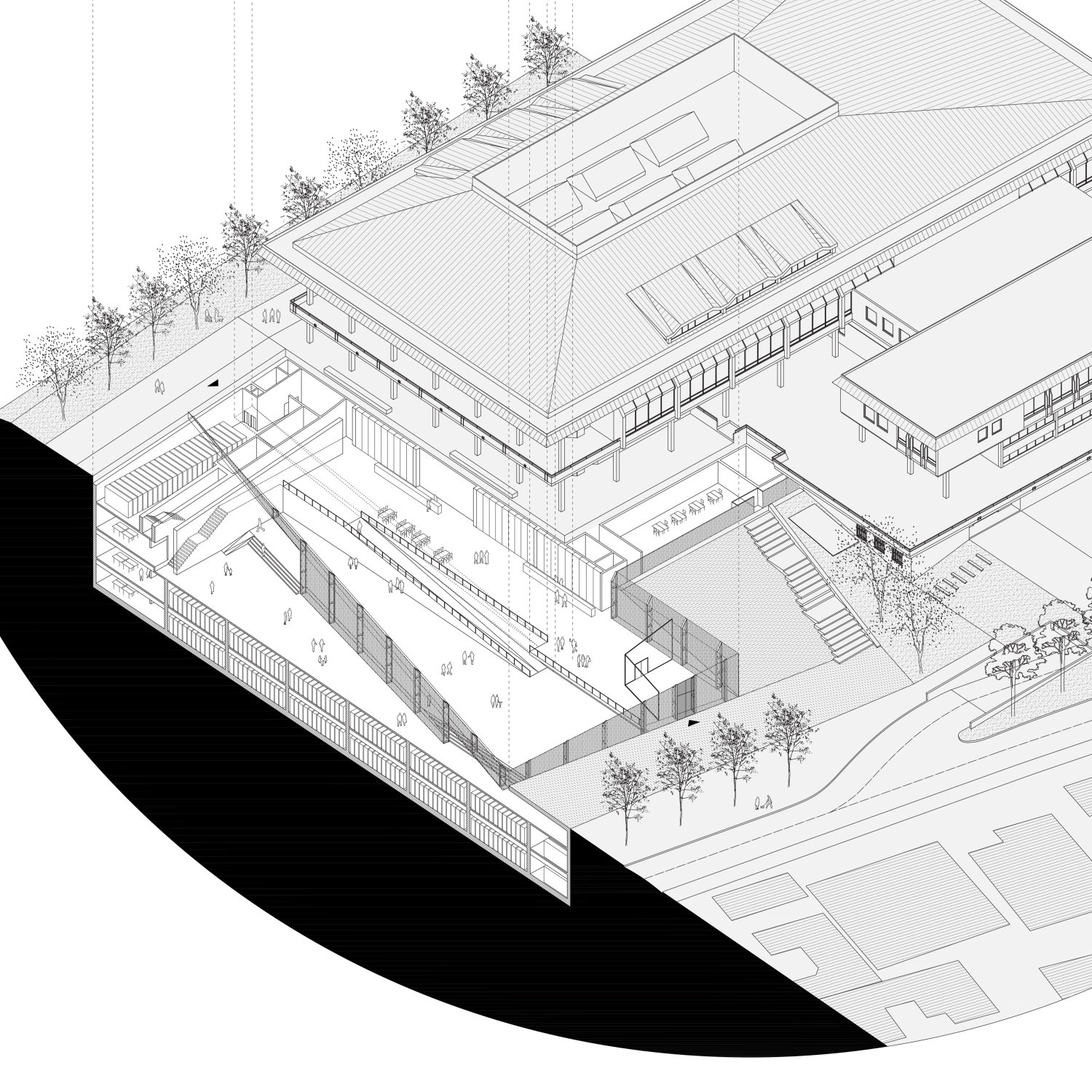 U širem kontekstu, pravci zasecanja tla pozicionirani su tako da omoguće povezivanje dva velika i značajna javna gradska prostora – Svetosavski plato i Karađorđev park, koji su trenutno grubo razdvojeni usnulim prostorom samog mesta intervencije, kao i Nebojšinom ulicom koja je intenzivno opterećena saobraćajem, paralelno sa Bulevarom oslobođenja.