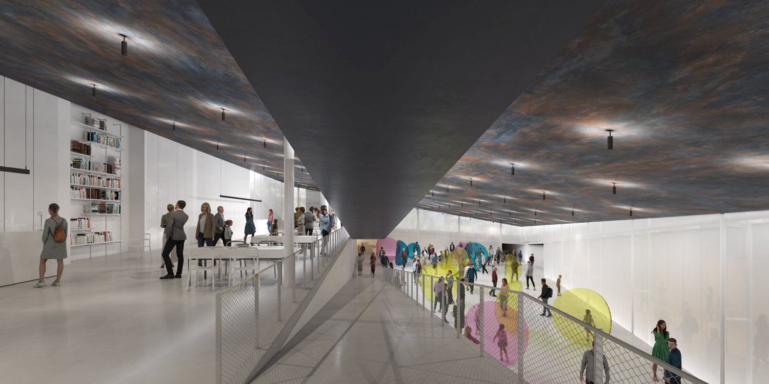 Veliki reprezentativan izlagački prostor zauzima zonu odmah ispod pokrenutih ozelenjenih ravni tla, ujedno i krova Galerije, i kaskadno je fomiran tako da volumetrijski prati pad krovnih ravni iznad, kako bi se sa tačke ulaza sagledavao ceo prostor u planovima. Ulazni hol proteže se celom dužinom objekta na najvišoj koti, sa pogledom na postavku sa visine, i sa izložbenim delom je povezan rampom.