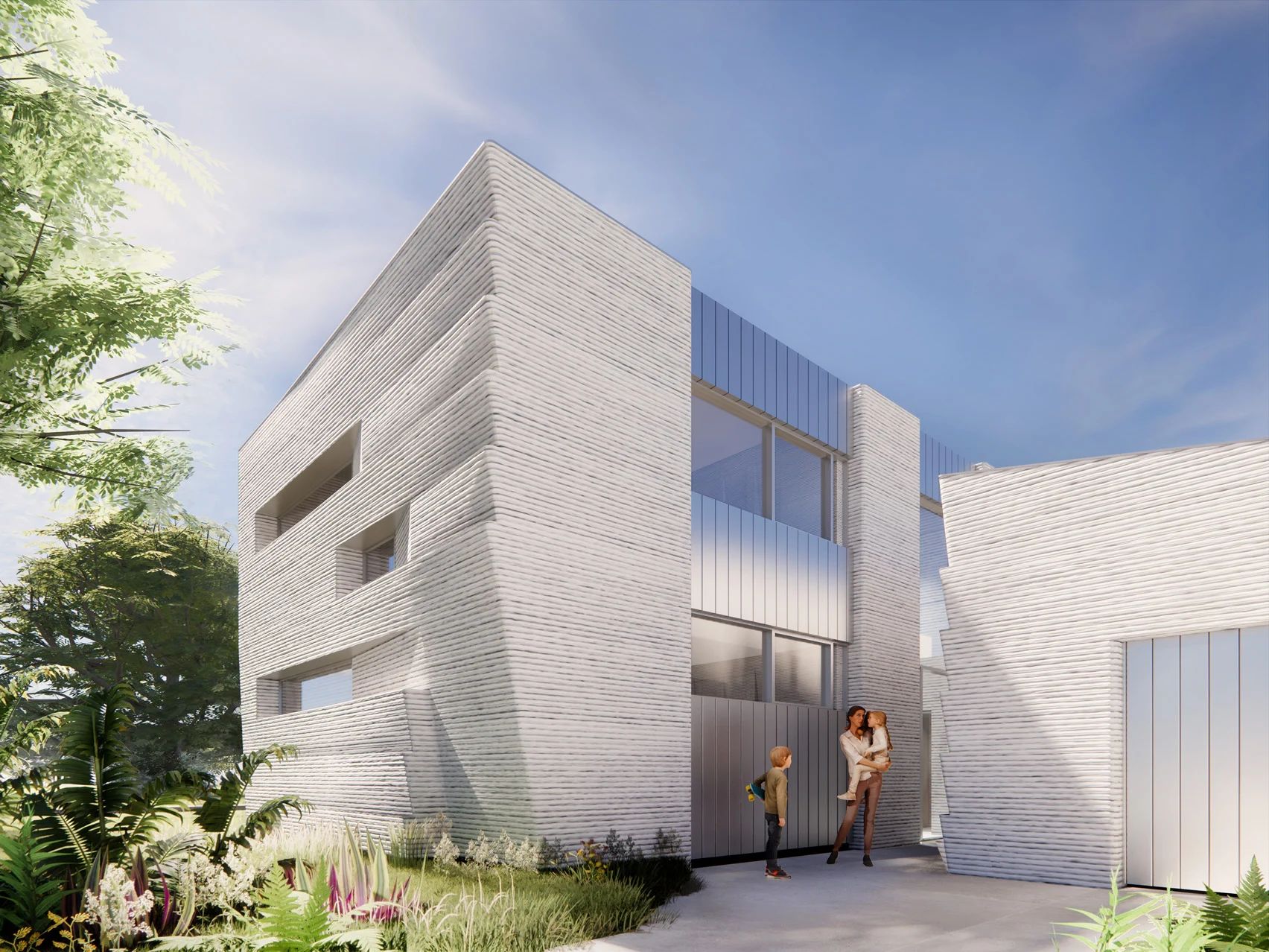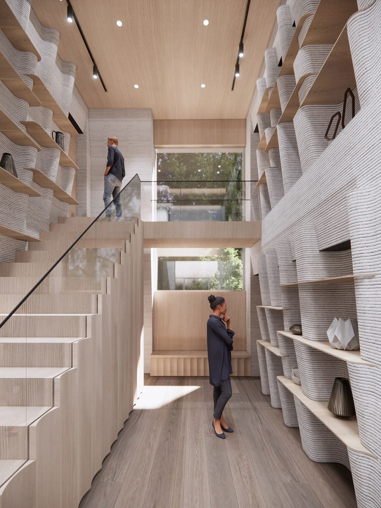 Hibridna struktura će biti izgrađena od 3D štampanog betona u kombinaciji sa drvenom konstrukcijom i dizajnirana je kao višespratna kuća za jednu porodicu.