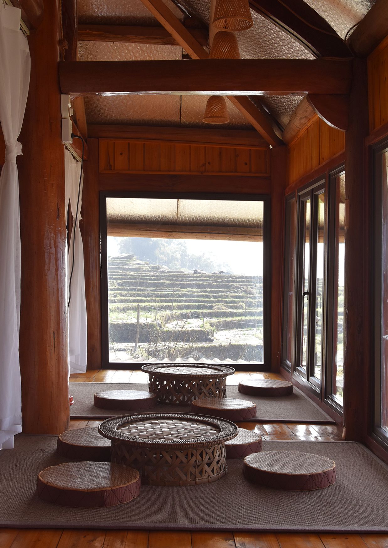 Sve je bilo od drveta i bambusa u tom malom prenoćištu – krov, noseći i pregradni zidovi, podna i zidna obloga, veranda, ali i nameštaj. Sobe su bile pristojnih veličina, a veliki open space, namešten sa malo nameštaja, bio je namenjen za ručavanje, rad i odmor.