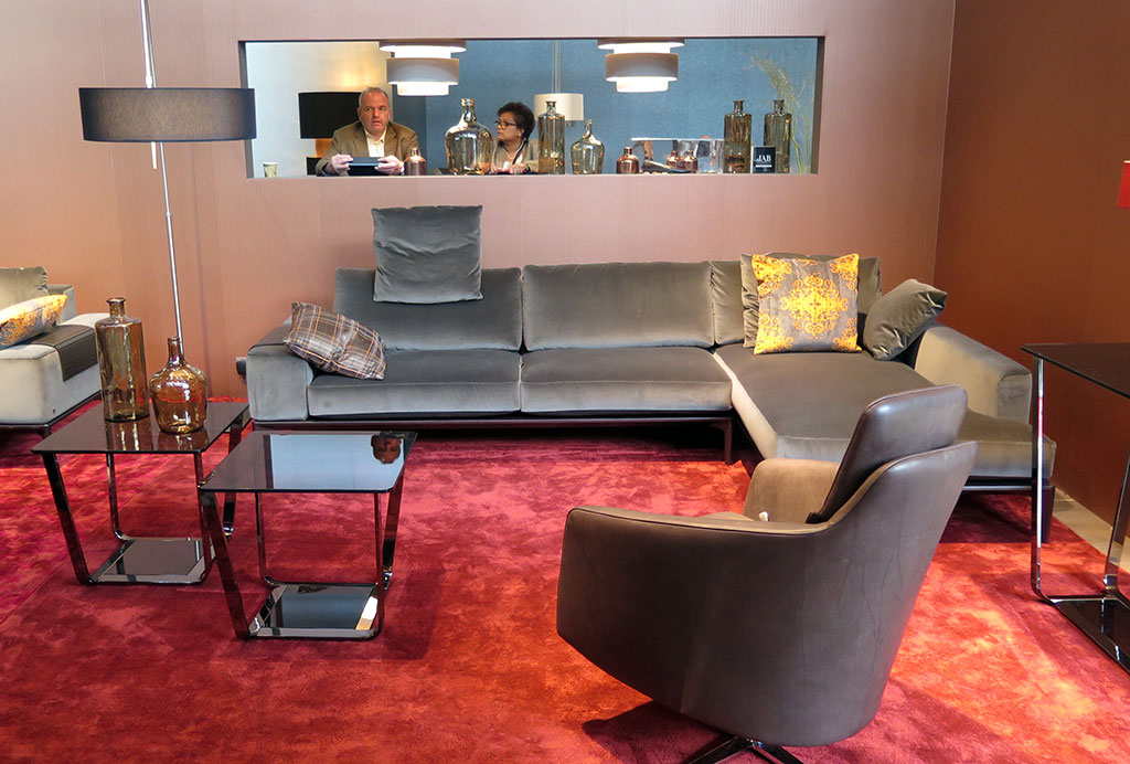 Za početak, čuveni proizvođač tkanina JAB predstavio je deo svoje kolekcije nameštaja na ovogodišnjem sajmu pod nazivom JAB Home. Štandom je dominirala narandžasta boja kako na sofamo tako i na tepisima.