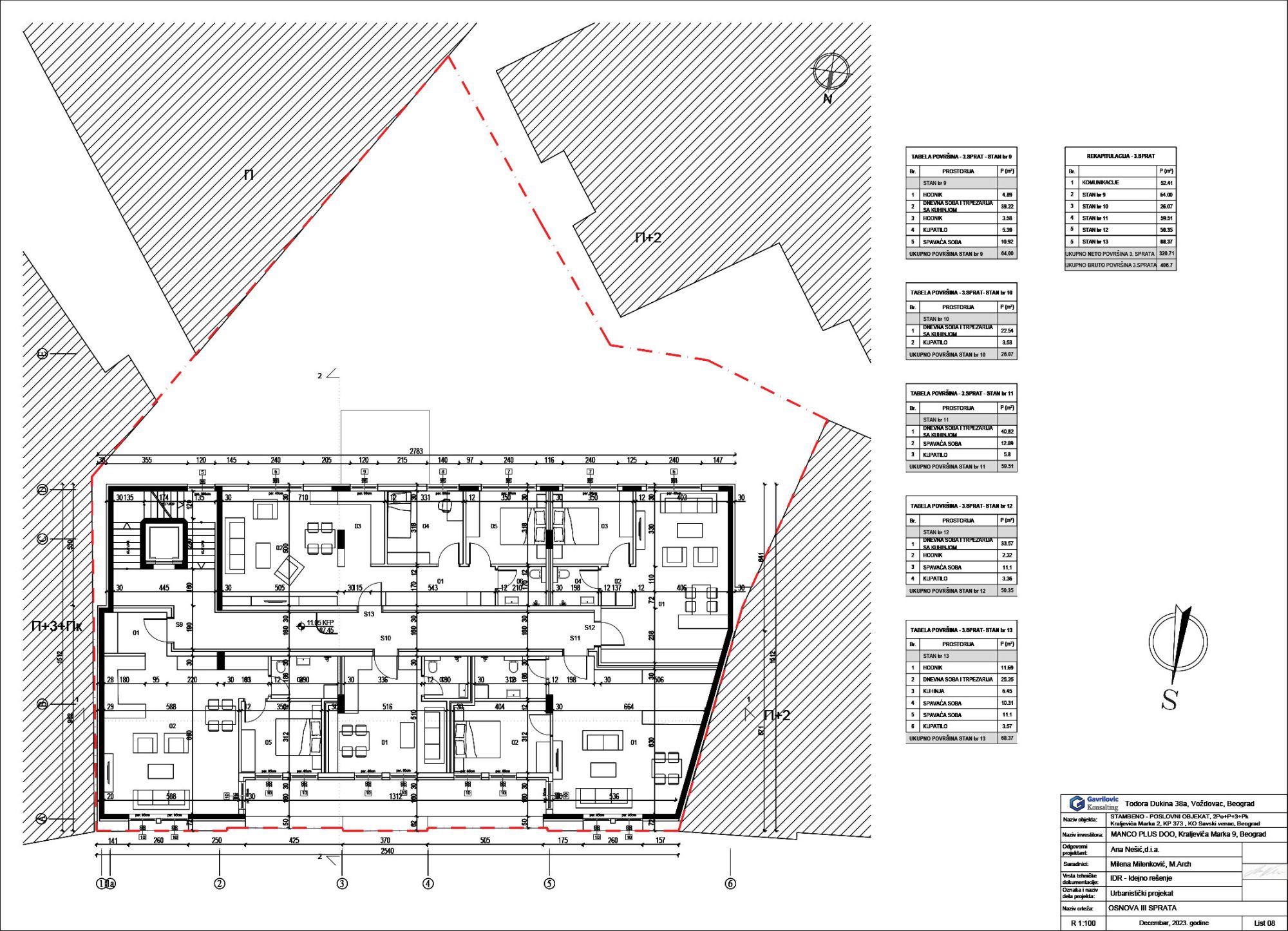 Ukupna bruto površina svih etaža po SRPS-u iznosi 3.510 metara kvadratnih.