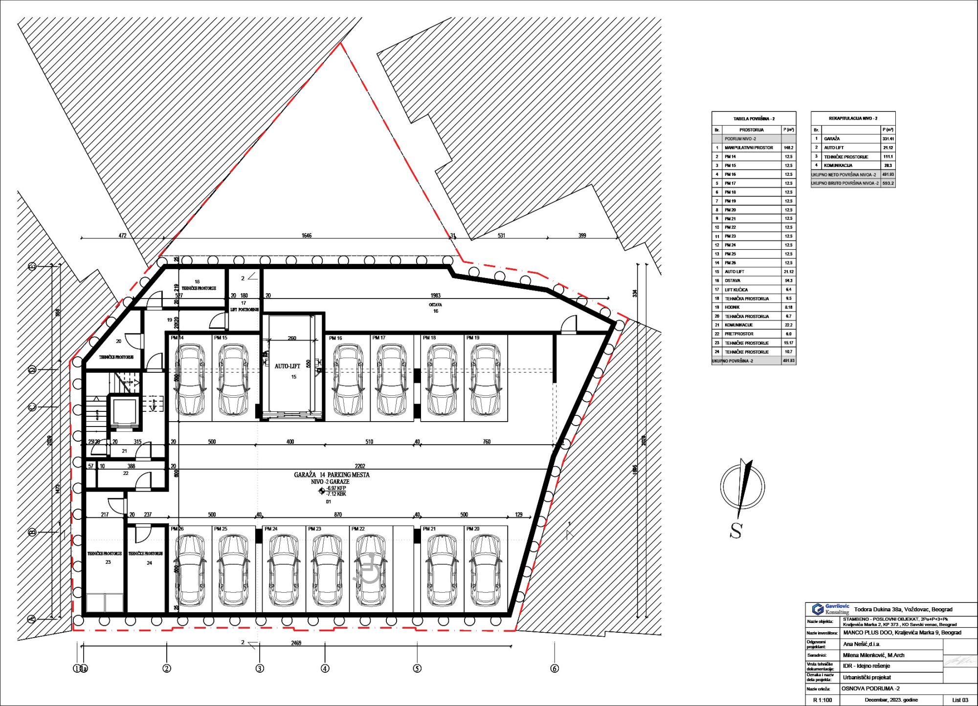 Manipulativni prostor u garaži je širine 600 cm, dok neto površina podruma -1 i podruma -2 iznosi po 491,93 m².