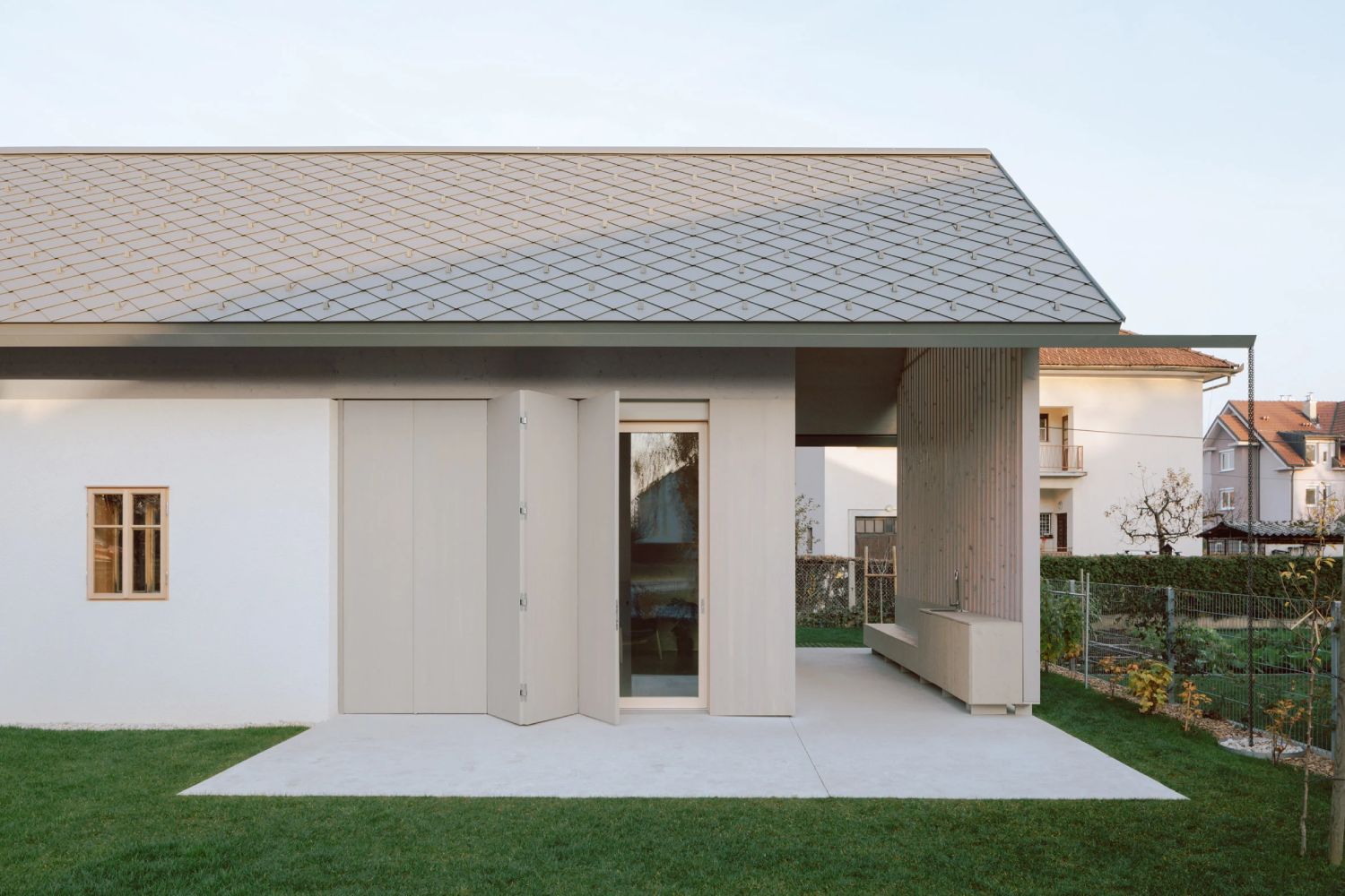 Novi dodatak u skladu je sa zabatnim profilom originalne strukture, ali je iznutra obložen svetlim drvetom kako bi se ipak razlikovao od originalne strukture od opeke.