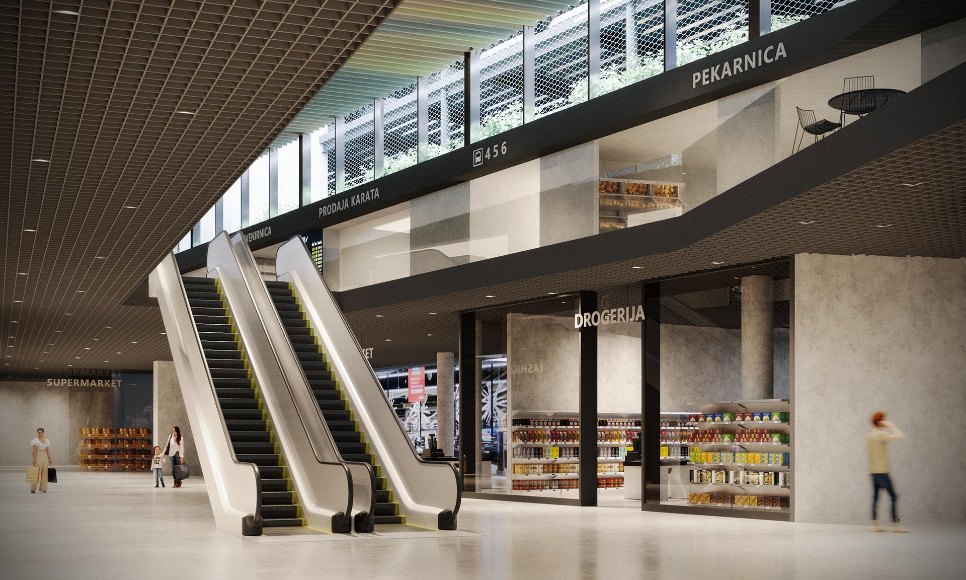Unutar zgrade smešteni su autobuski terminal s 14 perona i 6 autobuskih parkirališta, javna garaža za preko 800 vozila, tržni centar s pratećim ugostiteljskim i komercijalnim sadržajima u prizemlju, te poslovni i javni sadržaji na višim etažama.