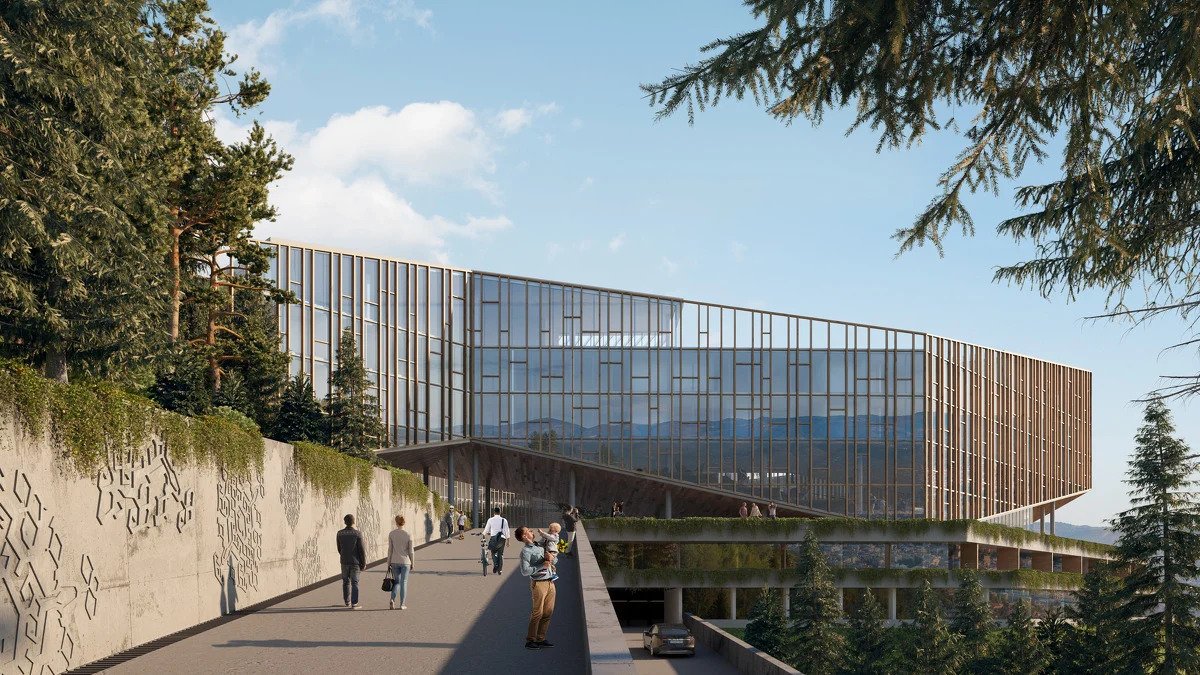 Sama forma zgrade predstavlja ravnotežu između okolnog pejzaža inspirisanih borovom šumom i stenama te pažljivo osmišljenim sadržajima.