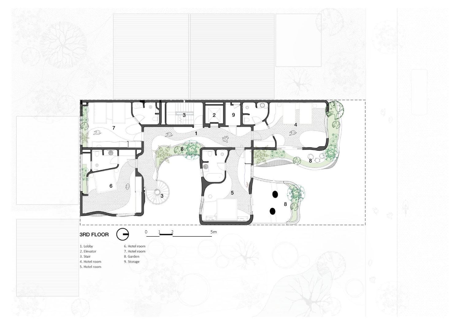 Hotel površine svega 321 m² sa vertikalnim baštama i atrijumom ispunjenim prirodnim svetlom redefiniše odnos arhitekture i prirode.
