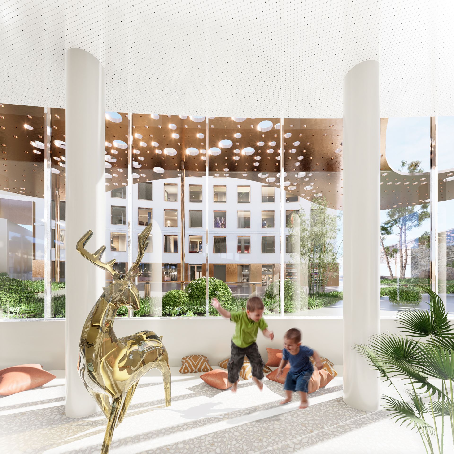 Preko šupljih stubova, kišnica odlazi do kolektora u garažama gde se voda prečišćava i ponovo koristni za zalivanje, toplotne pumpe i kao sanitarna. U prizemlju stambene zgrade postoji kafeterija, restoran, teretana, biblioteka, kao i vrtić.