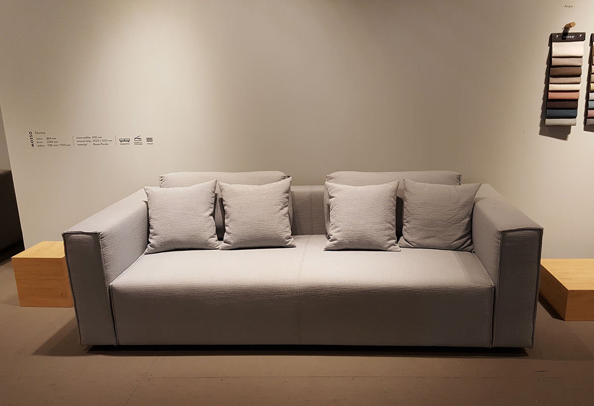 Trosed Norma brenda Mosso ima mogućnost razvlačenja. Njegova širina je 226 cm, razlači se u krevet dimenzija 202×155 cm i ima žičano jezgro sa sunđerom i silikonom. Takođe, poseduje i sanduk za odlaganje posteljine. Kako smo saznali na sajmu, rokovi za isporuku nameštaja brenda Mosso su 35 dana.