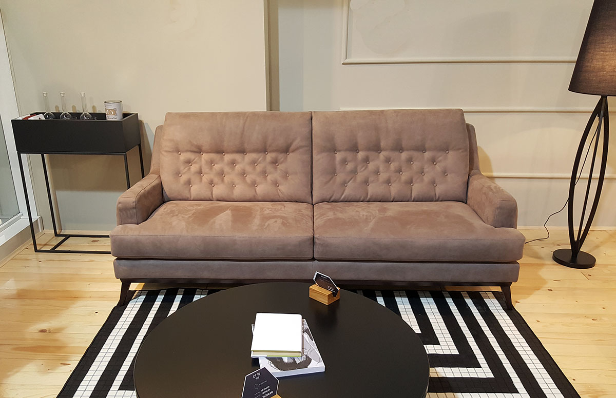 Osim modernog, na sajmu se mogu pronaći i zanimljivi modeli klasične forme. Tako je proizvođač iz Vranja Milenboss predstavio trosed Milchester u dimenziji 232×98 cm sa tabureom.
