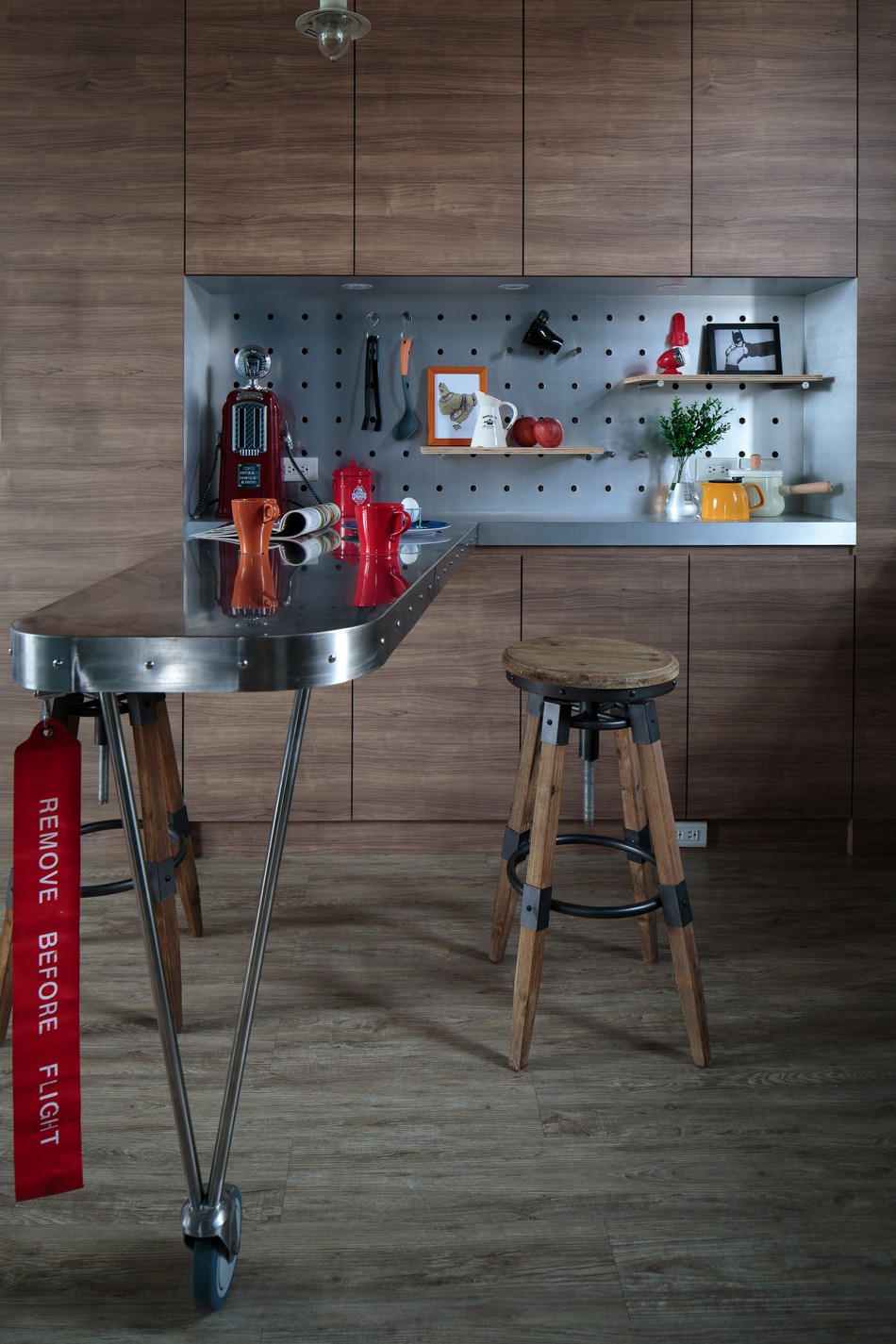 Detalja koji podsećaju na vazduhoplovstvo ima po celom stanu. Klizna metalna vrata u hodniku skrivaju kupatilo, perforirane metalne ploče u nišama, sanduci kao garderoberi… Kako bi se oblažila hladnoća metala, stan je utopljen nameštajem od hrastovog drveta.