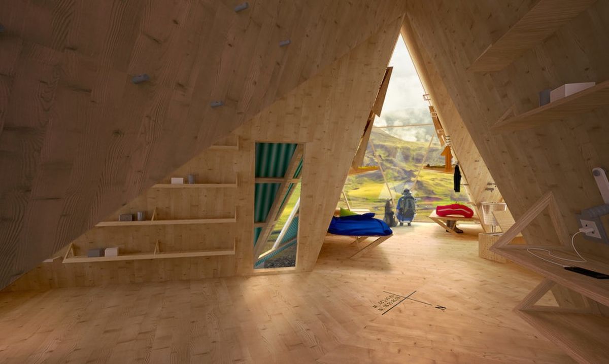 Četiri trouglasta, trostruko zastakljena prozora obezbeđuju puno prirodnog svetla u enterijeru, dok istovremeno, omogućavaju fantastičan pogled na panoramu. Zidovi su obloženi lameliranim drvetom od čega je napravljen i sav nameštaj u skloništu.