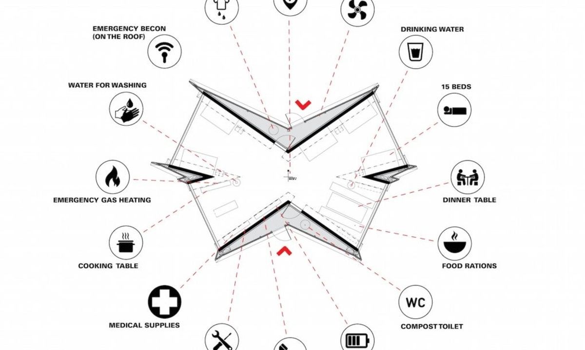 Sklonište ima četiri sobe: dve spavaće sobe, višenamensku kuhinju sa sobom za prvu pomoć i trpezariju sa ostavom, a cela konstrukcija smešta petnaest ljudi.