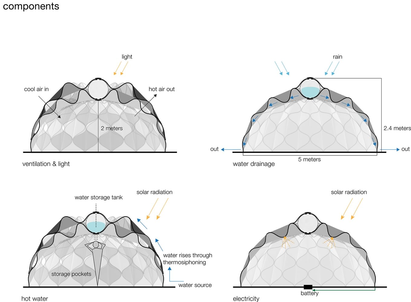 Rezervoar za vodu integrisan je u vrh kupolaste strukture a on se puni ili putem kišnice ili preko izvora na licu mesta u kom slučaju voda dolazi do rezervoara putem termosifoninga (toplota sunca utiče da se voda podigne do vrha šatora).