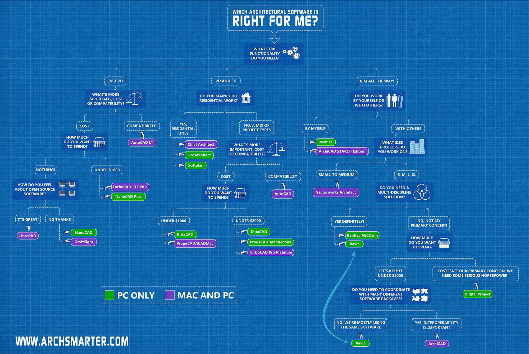 Stoga je ArchSmarter napravio ovu mapu koja će vam, prateći put kroz kriterijume, pomoći da izaberete pravi softver za vas: