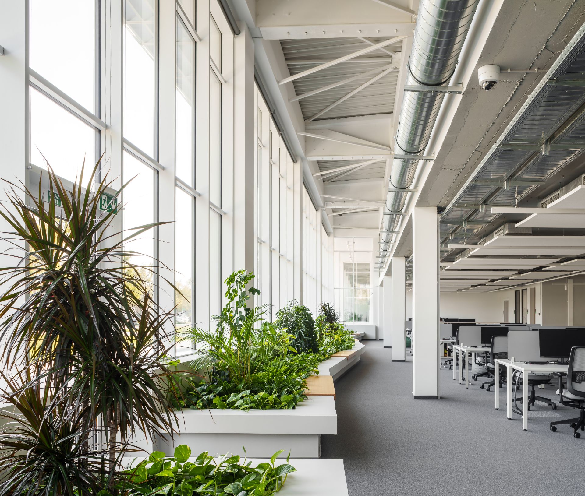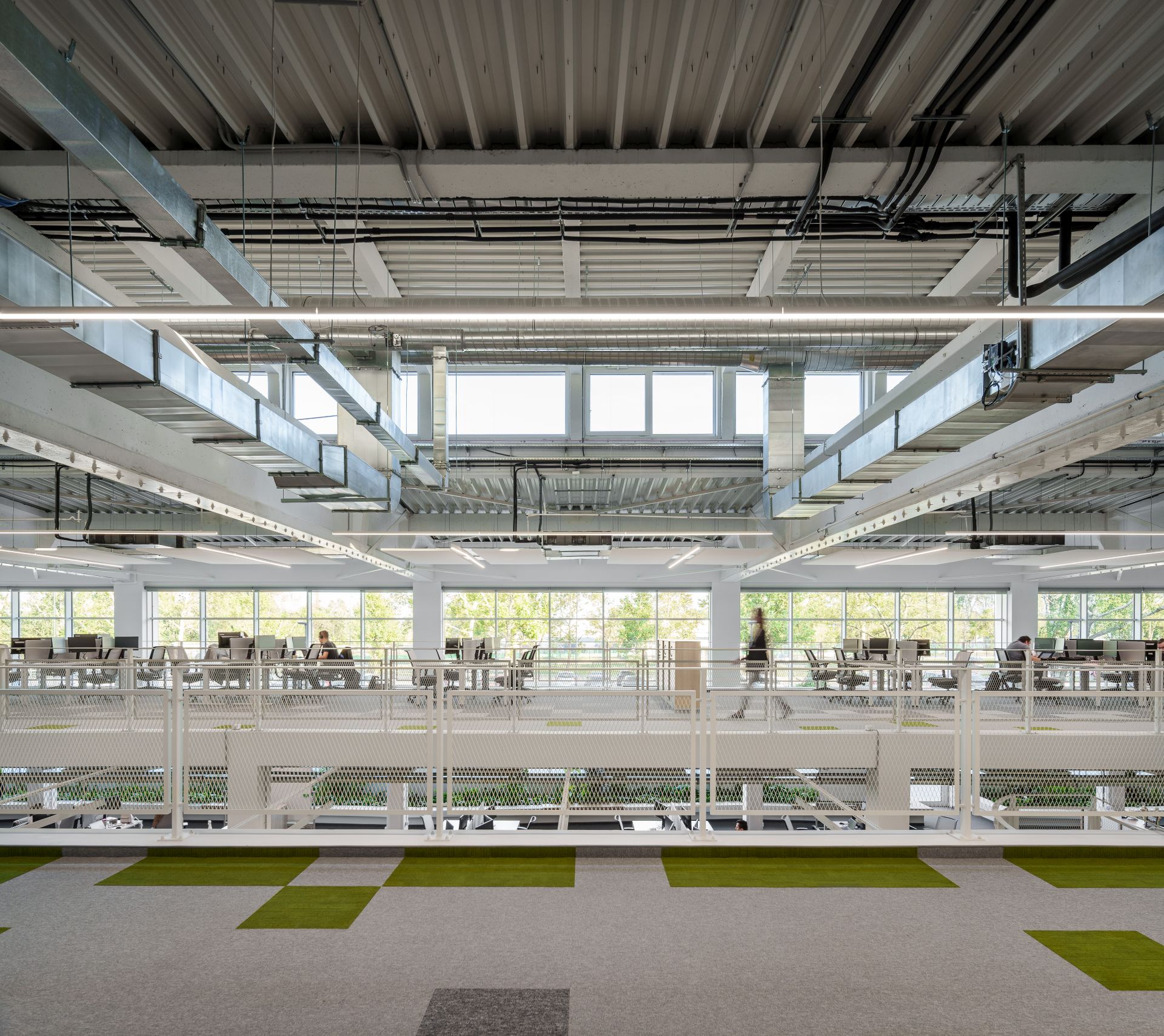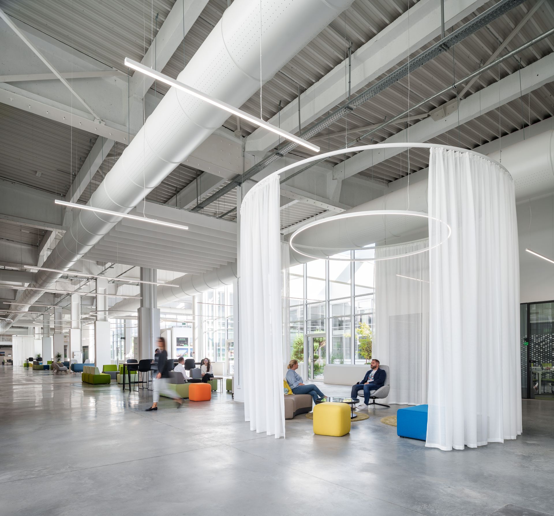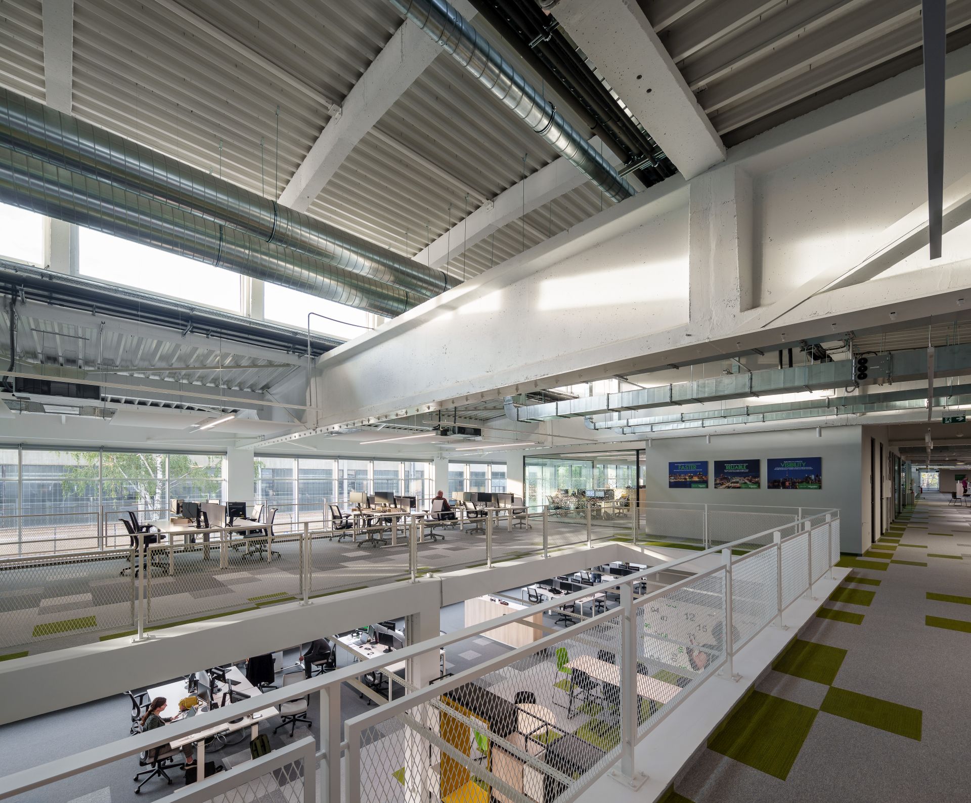 Ovde upravo možemo govoriti o unutrašnjoj arhitekturi, jer je prostor daleko više od običnog enterijera, pa se njegovom oblikovanju tako i pristupilo. Da bi se više od 700 zaposlenih osećalo što prijatnije tokom obavljanja svojih radnih zadataka, njihov ambijent je osmišljen tako da prirodno osvetljenje što više prodire u unutrašnjost i da se stavi akcenat na integraciju spoljnog i unutrašnjeg prostora.