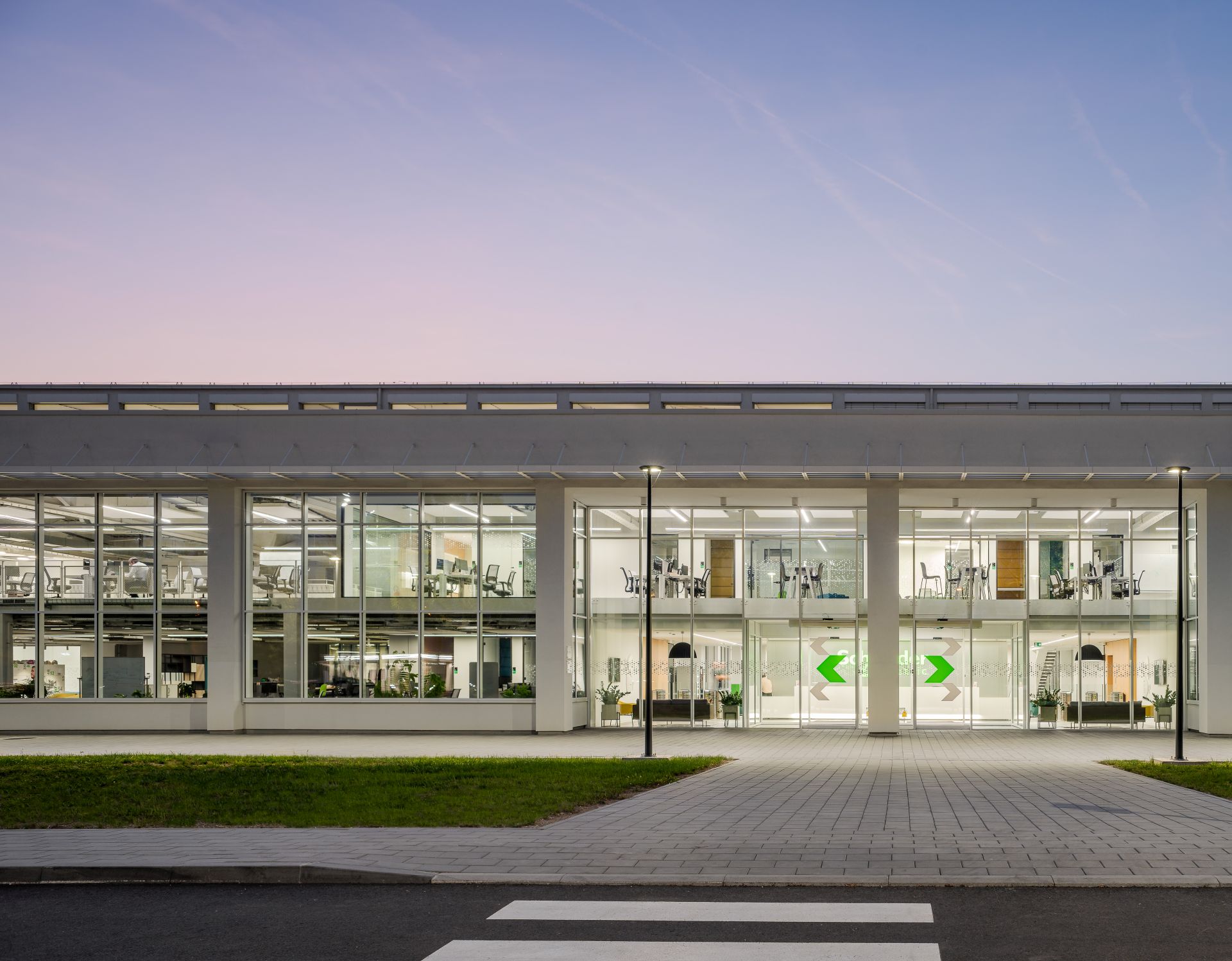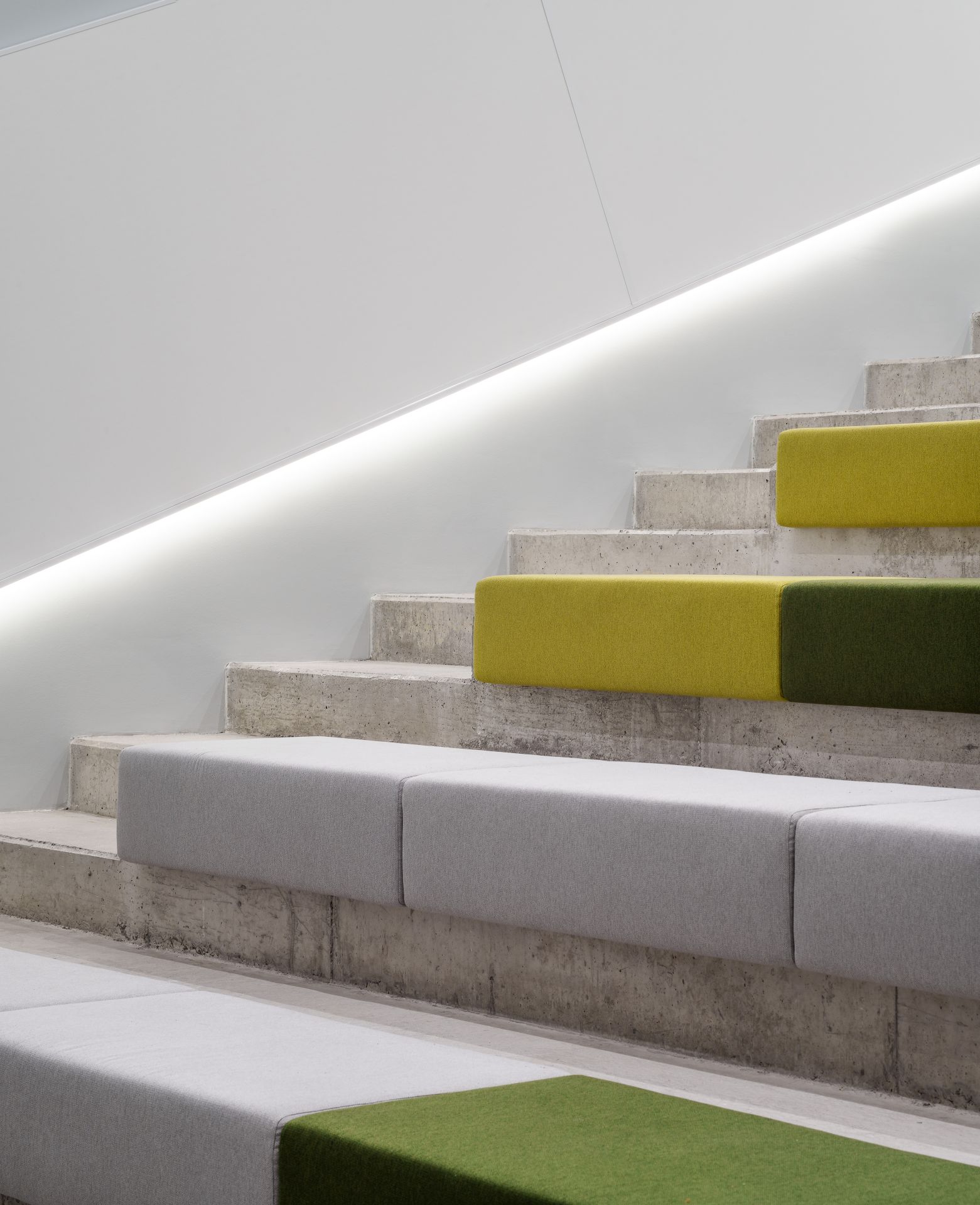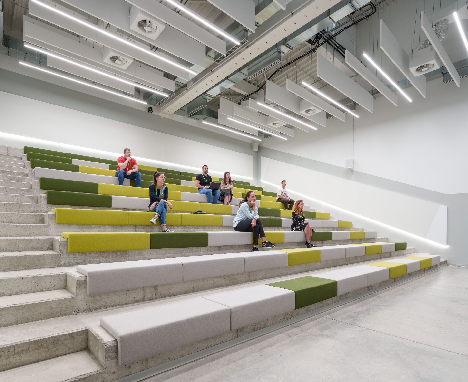Ovde upravo možemo govoriti o unutrašnjoj arhitekturi, jer je prostor daleko više od običnog enterijera, pa se njegovom oblikovanju tako i pristupilo. Da bi se više od 700 zaposlenih osećalo što prijatnije tokom obavljanja svojih radnih zadataka, njihov ambijent je osmišljen tako da prirodno osvetljenje što više prodire u unutrašnjost i da se stavi akcenat na integraciju spoljnog i unutrašnjeg prostora.