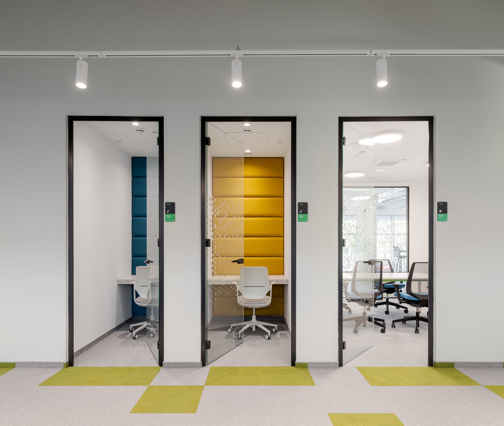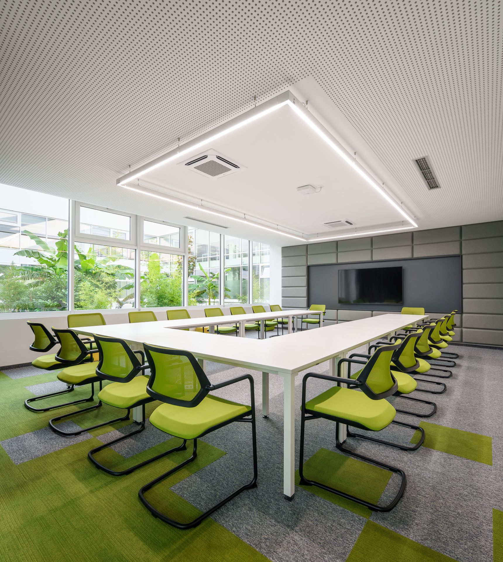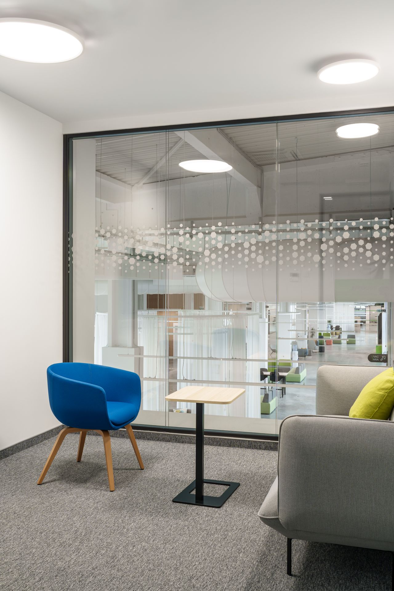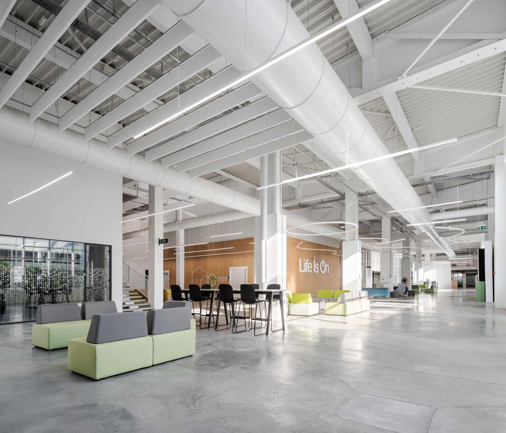 Ovde upravo možemo govoriti o unutrašnjoj arhitekturi, jer je prostor daleko više od običnog enterijera, pa se njegovom oblikovanju tako i pristupilo. Da bi se više od 700 zaposlenih osećalo što prijatnije tokom obavljanja svojih radnih zadataka, njihov ambijent je osmišljen tako da prirodno osvetljenje što više prodire u unutrašnjost i da se stavi akcenat na integraciju spoljnog i unutrašnjeg prostora.