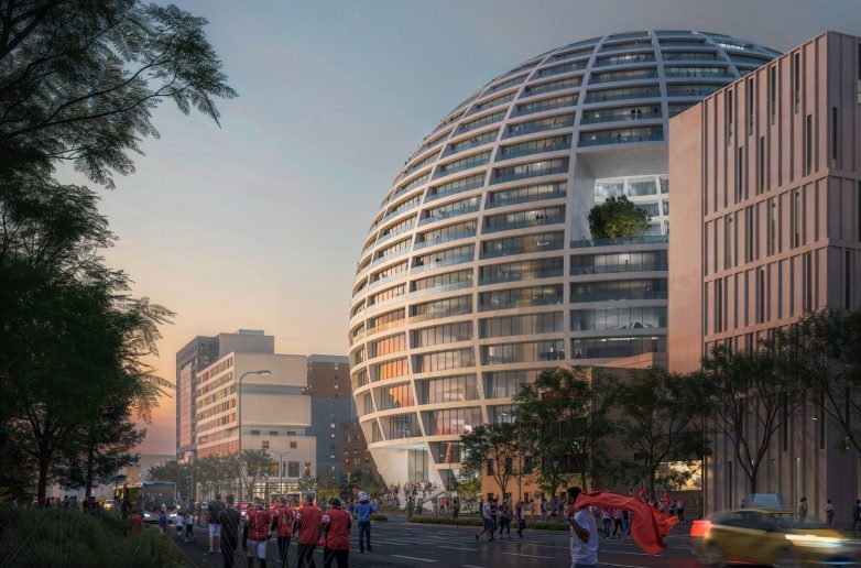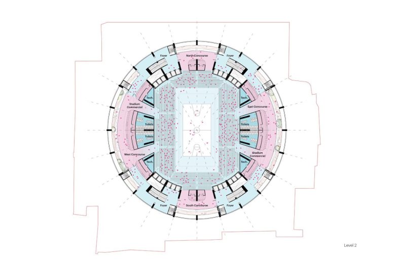 Sferni oblik, koji dominira prikazima projekta, referiše na sportsku loptu, ali i na istorijske arhitektonske koncepte koji su slavili prosvetiteljstvo i tehnološki napredak — od Buléeovog Cenotaph-a za Njutna do geodetskih struktura Bakminstera Fulera. Kako objašnjava Vini Mas, partner u MVRDV-u, cilj je bio da se oblikom postigne univerzalnost: objekat koji nema „zadnju stranu“, već fasadu koja aktivno komunicira sa svim pravcima grada. Time zgrada postaje središte zajednice, a ne zatvorena sportska arena.