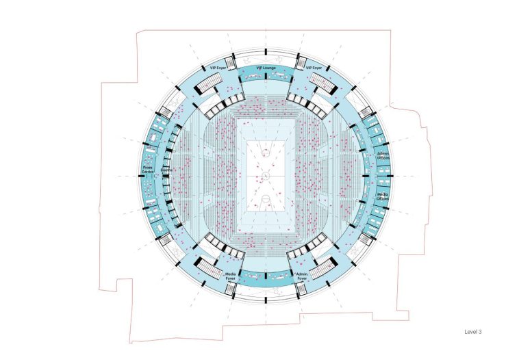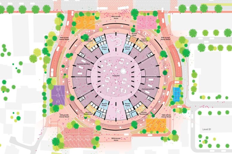Sama sfera je pri dnu odsečena kako bi se otvorio prostor za javne trgove, sportske sadržaje i prsten maloprodajnih lokala u kontaktu sa ulicom. U prizemlju, niz stepenica vodi do više ulaza raspoređenih oko celog volumena; svi se ulivaju u kružni hol okružen trening salama i javnim sadržajima.