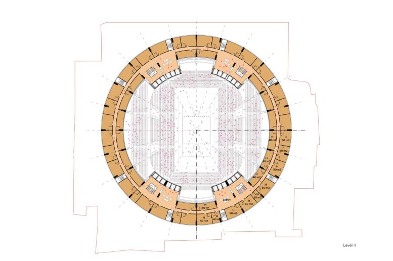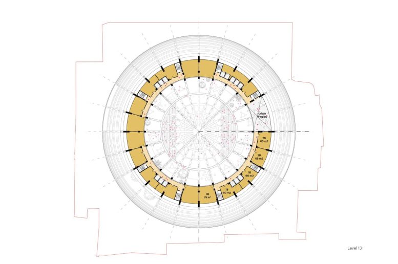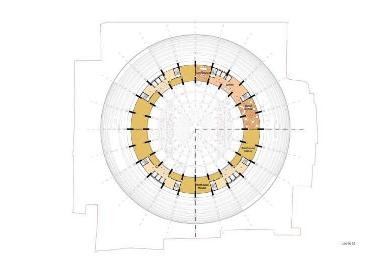 Ka vrhu sfere, stambeni apartmani formiraju prsten oko visokog centralnog atrijuma, pokrivenog pokretnim krovnim prozorom koji omogućava prirodno osvetljenje i ventilaciju. Na najvišim etažama nalaze se privatne krovne terase i bar, dok je niz prostranih penthausa projektovan kao završni sloj objekta.