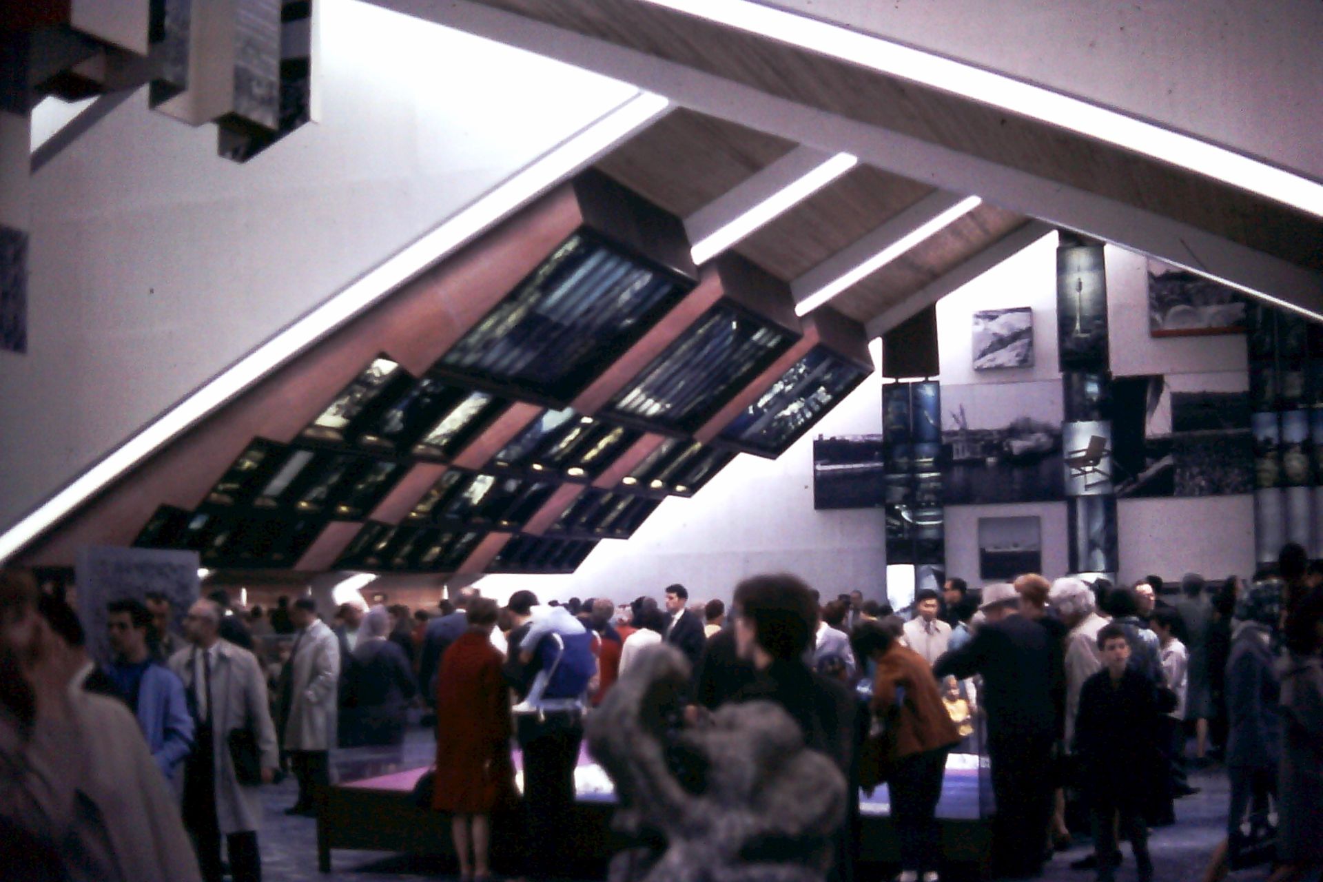 Čim bi posetioci ušli na vrata paviljona, prva karakteristika koja ih je verovatno začudila bio je ogroman niz folija sa fotografijama u boji sa pozadinskim osvetljenjem, koje pokrivaju veliki deo plafona.