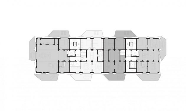 Silos pravougaonog oblika, koji je služio za skladištenje žitarica, dobio je daleko interesantniju fasadu postvaljanjem konzolnih prepusta koje služe kao terase.