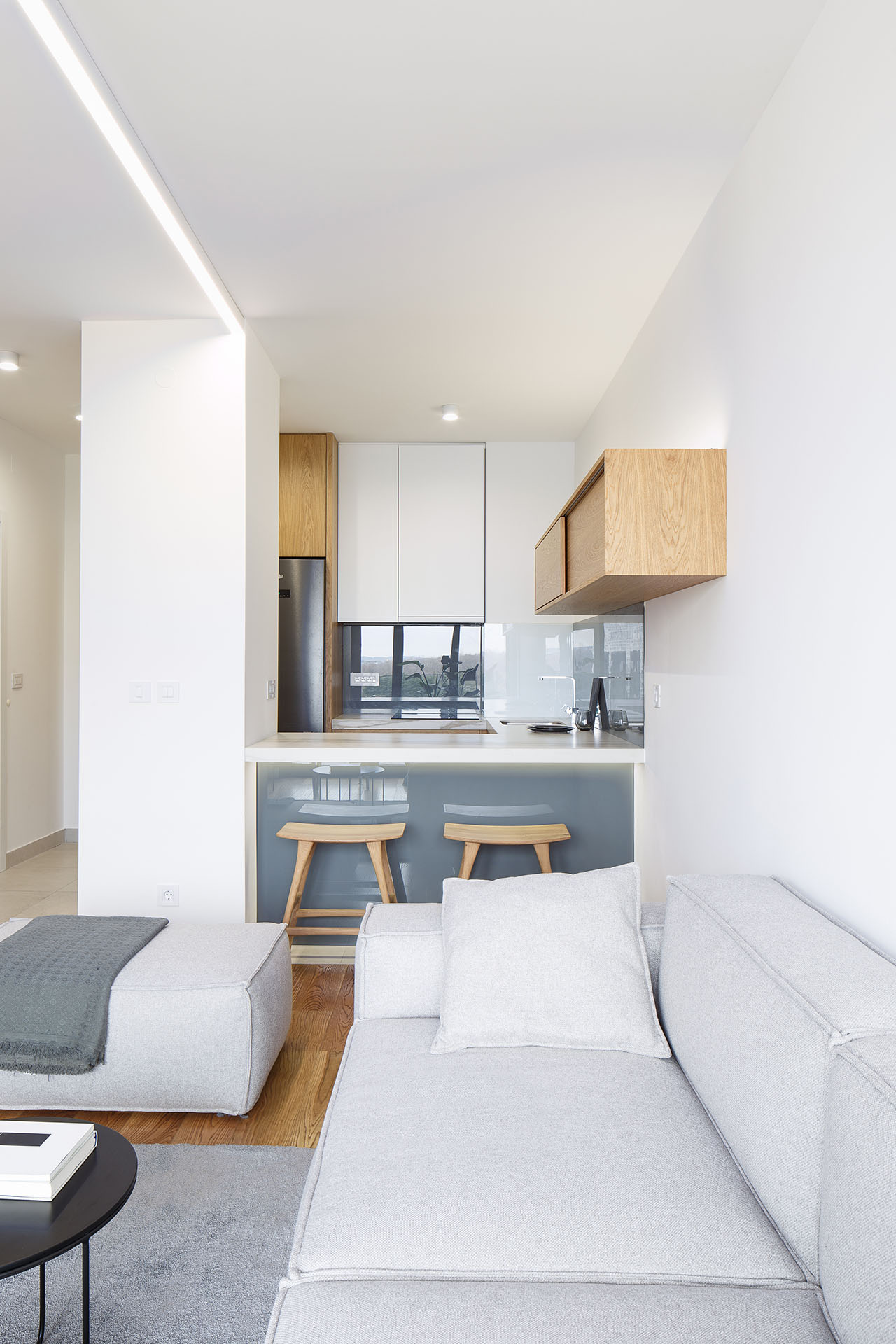 Pozicijom šanka, dizajniran je prekid u funkcionalnim zonama dnevne sobe i kuhinje, dok je istovremeno omogućen vizuelni kontinuitet do kraja stana.