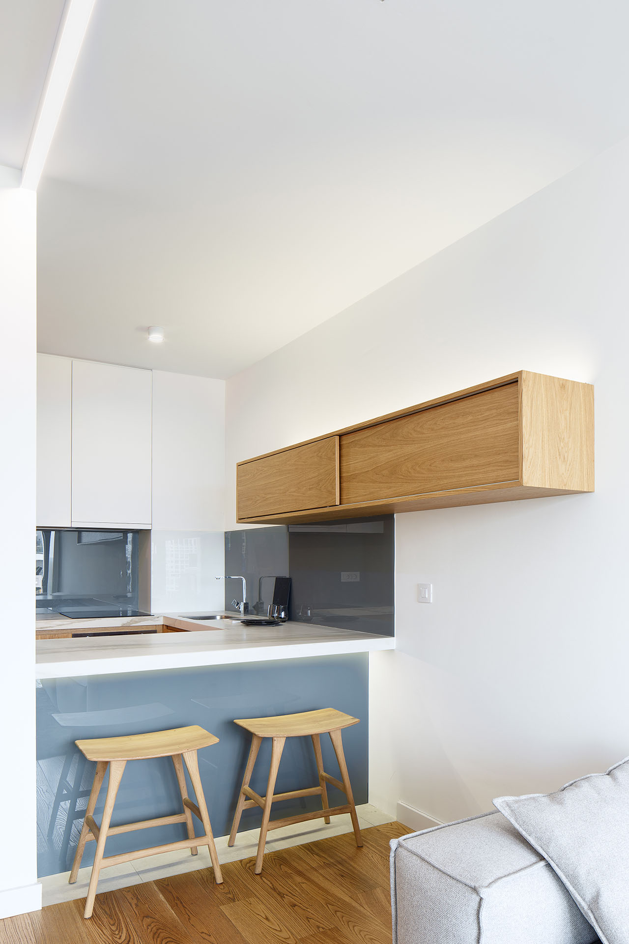 „Isti vizuelni jezik zastupljen je u kuhinji, u kojoj su gornji elementi tretirani kao zidne površine – belom bojom, dok donji elementi nastavljaju vizuelni ključ prostora za odlaganje iz ostatka stana – u toplim drvenim tonovima“ – navodi arhitekta.
