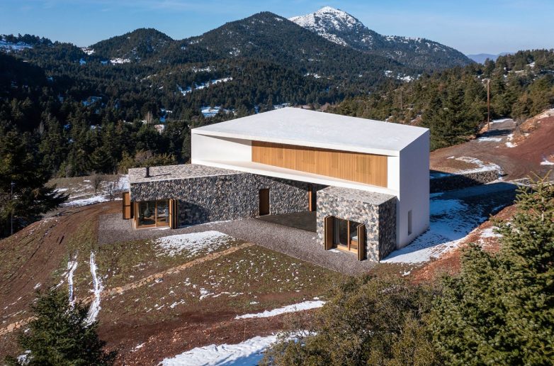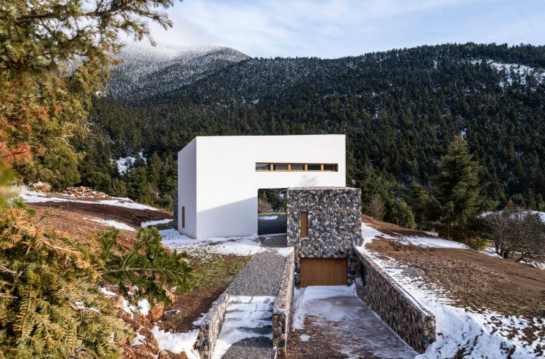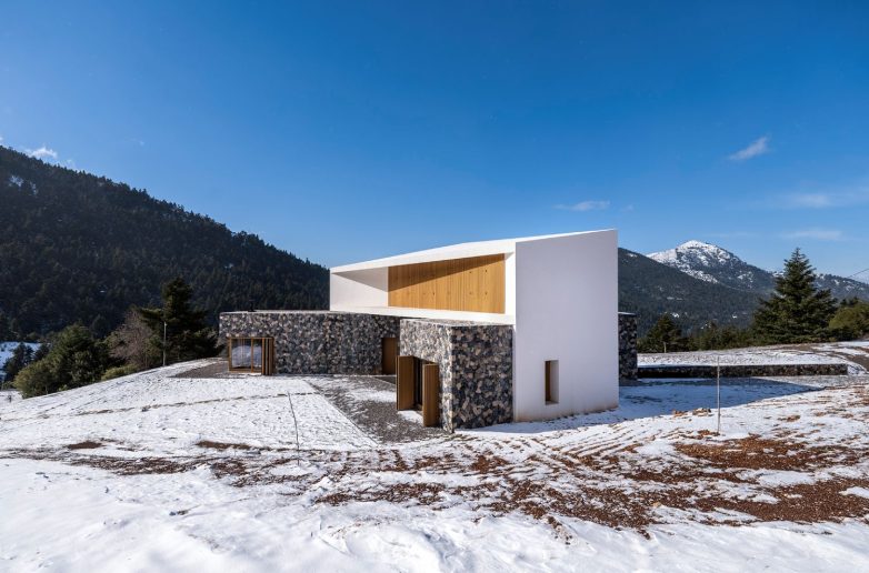 Na kamenoj bazi kreiran je beli volumen koji podseća na velike snežne nanose karakteristične za ovu planinu na Peleponezu.