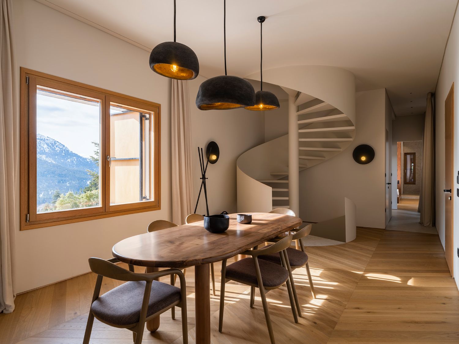 Unutrašnjošću kuće dominiraju suptilan i bezvremenski dizajn, zemljani tonovi, drveni podovi i nameštaj, kao i veliki fasadni otvori koji omogućavaju da prirodna svetlost, boje i materijali iz okruženja prodru i u unutrašnjost kuće.