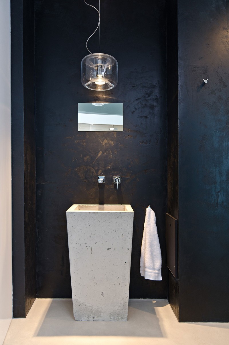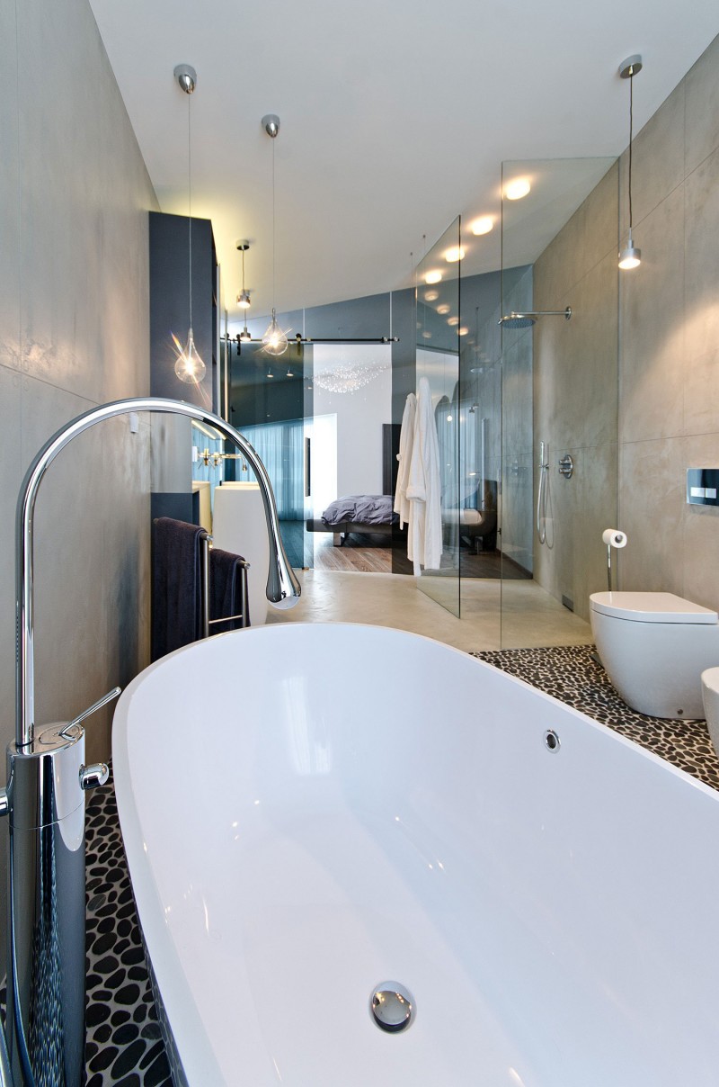 Na drugom nivou nalazi se spavaća soba s prostranim kupatilom, đakuzijem i saunom u staklu. I ovde beton preovađuje eneterijerom ali je uz pomoć tkanina, keramike i svetla ponovo ublažena njegova grubost.