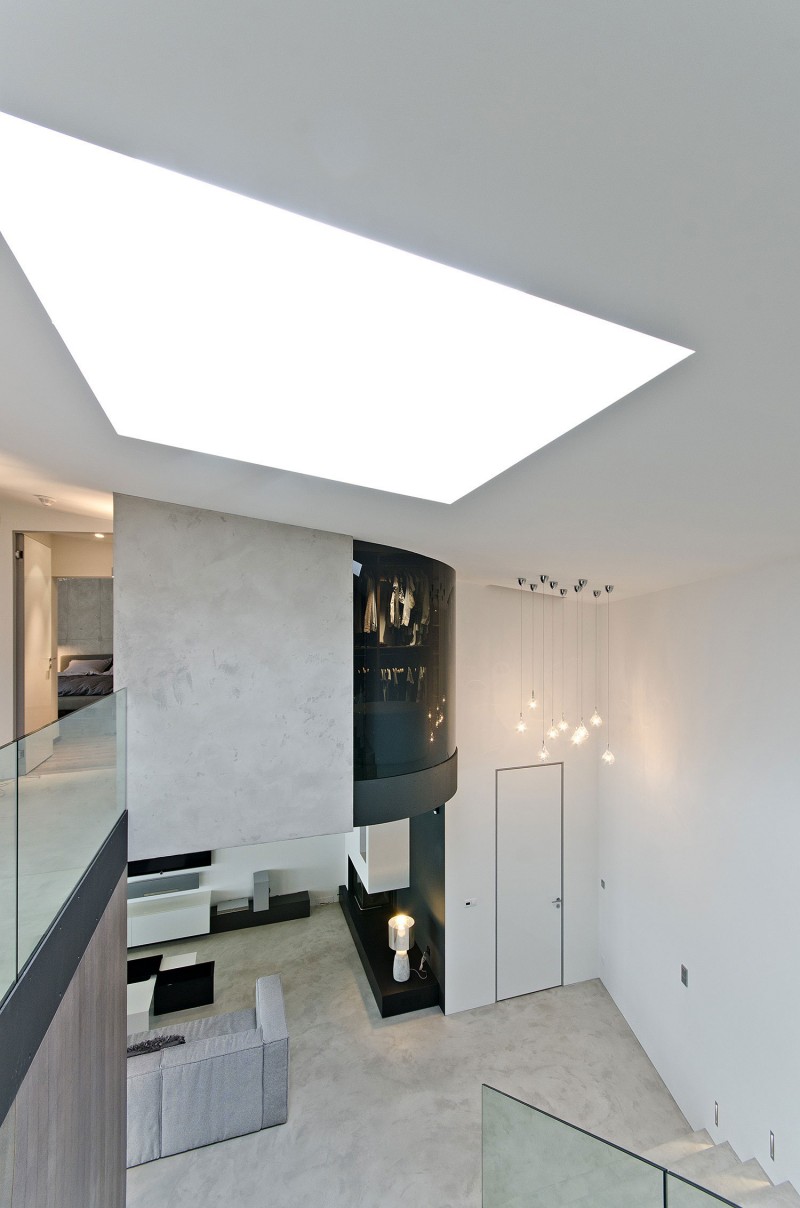 Središte stana skoncetrisano je oko minimalističke otvorene dnevne sobe s trepezarijom u neutralnim bojama. Samo nekoliko komada namešaja i pažljivo odabrana rasveta daju prostoru jedinstven ton. Hladno sivi beton na tavanici je u kontrastu s drvenim elementima i belom sjajnom kuhinjom.