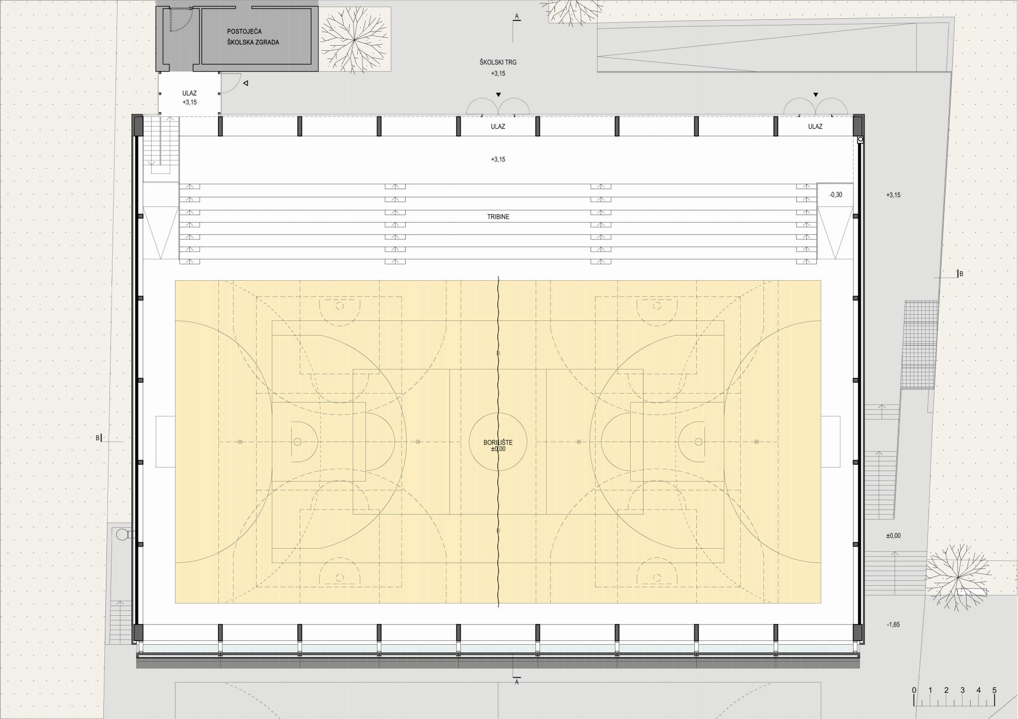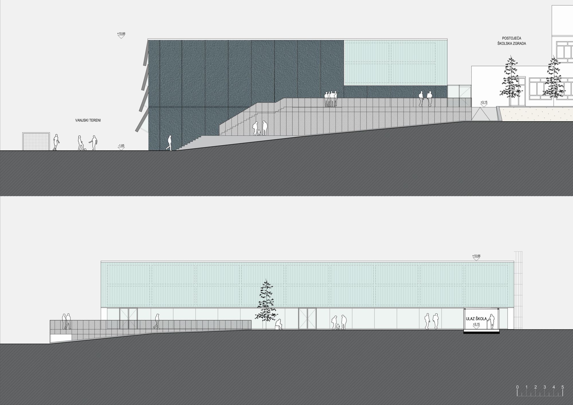 Kako je na parceli teren u padu od istoka prema zapadu, u enterijeru je ostvaren prostorni kontinuitet od povišene galerije u nivou školskog trga do sportskih terena koji su u nivou pristupa na jugu.