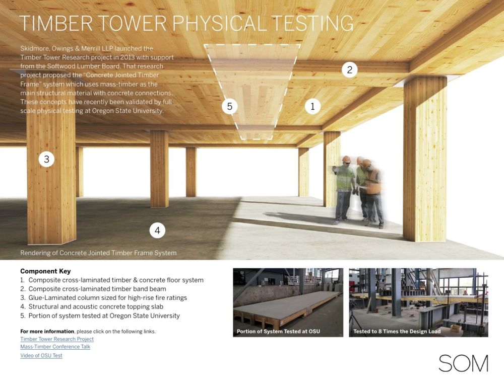 Testiranje ovog sistema povereno je Univerzitetu u Oregonu koji je ovu konstrukciju u realnoj veličini podvrgao brojnim rigoroznim testovima. Nakon uspešnih rezultata, SOM je zaključio da „ima jake dokaze da ova drveno-betonska kompozitna konstrukcija može da zadovolji standarde i da konkuriše tradicionalnim metodama gradnje.“
