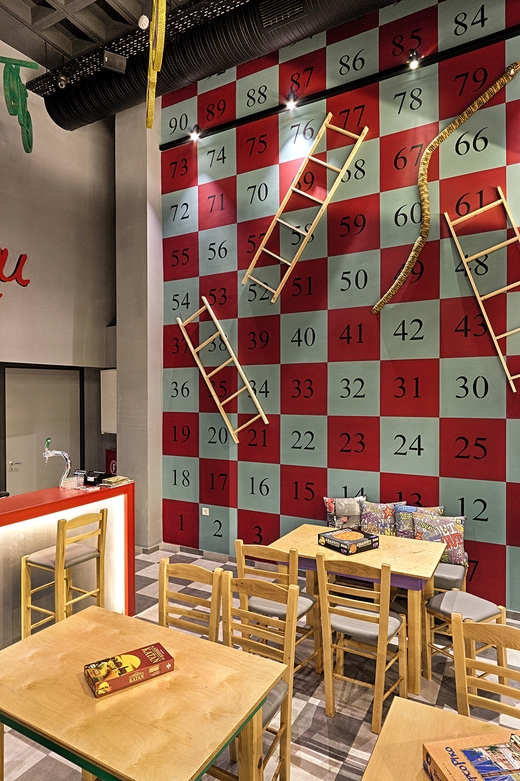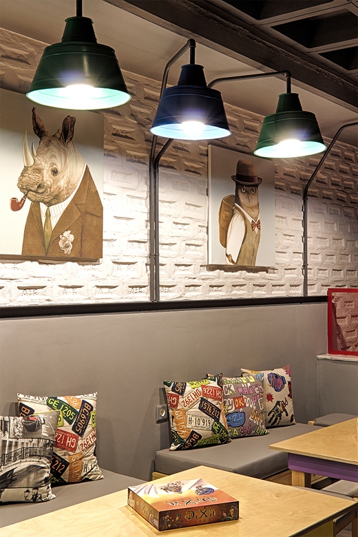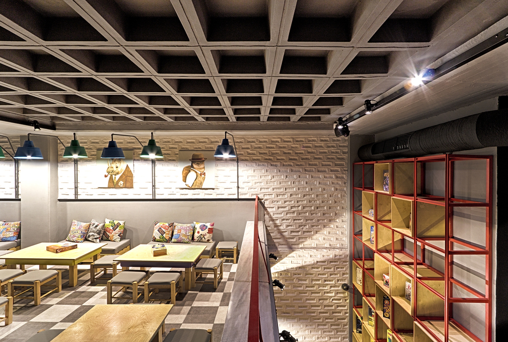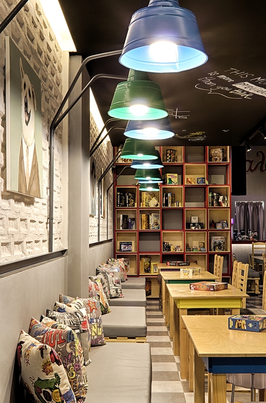 Kombinovanjem jednostavnih formi i linija sa jakim detaljima na zidovima, podovima i tavanici uz korišćenje živih boja na jastučićima, rasveti i stepeništu napravljen je prostor u koji bi rado kročili i oni kojima igre poput Magic The Gathering, Pokemon, Warcraft ili Middle Earth ne znače ništa.