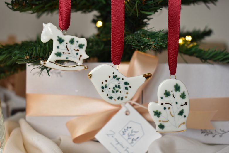 Talentovana Jovana Radenković pravi neodoljive ručno rađene i oslikane ukrase za jelku. Ukrasi su izrađeni od porcelana, a oslikani zlatni detalji su od 24 karatnog zlata za keramiku. U jednom setu se nalaze tri ukrasa različitog oblika.