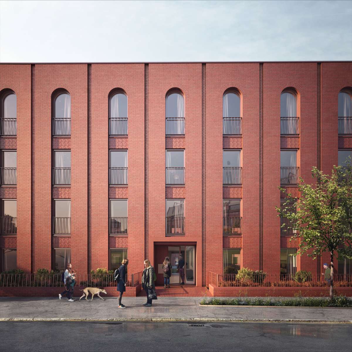 Stambeni kompleks od crvene opeke, koji bi sadržao 160 stambenih jedinica dvostrano orijentisanih, činila bi dva četvorospratna bloka okrenuta jedan prema drugom kako bi zajedno formirali oblik stadiona.