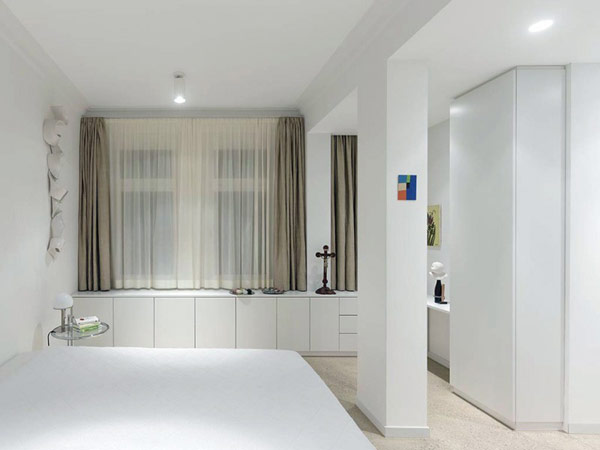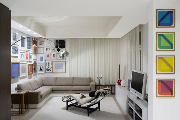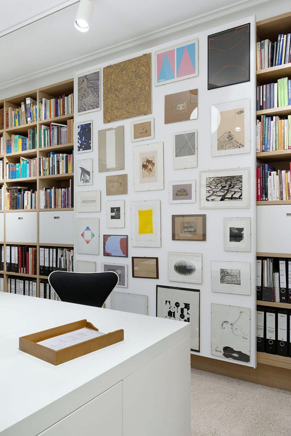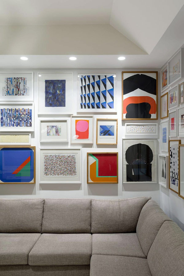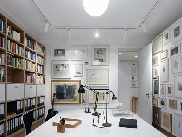 Beli zidovi su ispunjeni slikama i grafikama koji daju ritam i kolorit celom prostoru. Sveden nameštaj: police, sofa, stolice su takođe neutralnih nijansi kako bi dopustile umetničkim slikama da se istaknu.