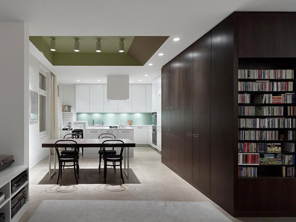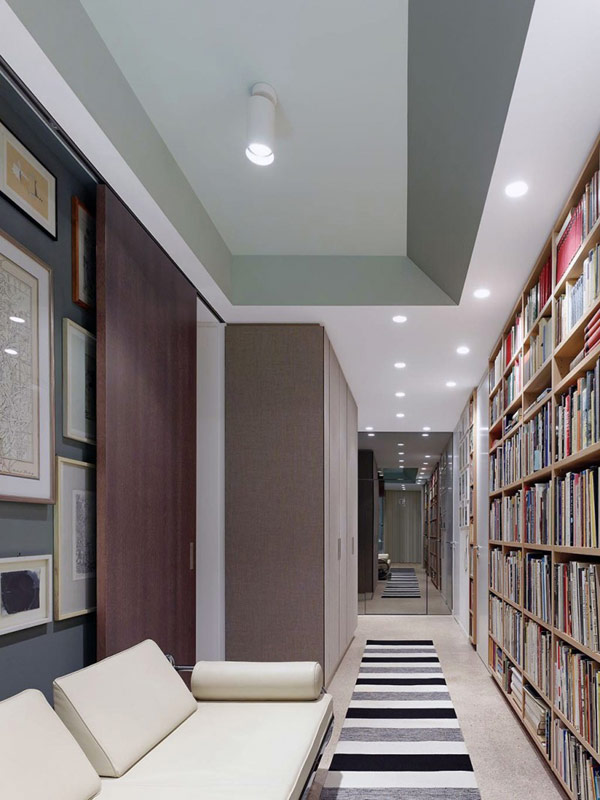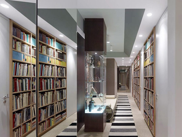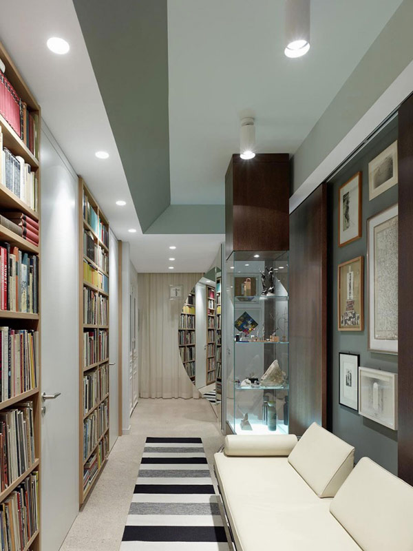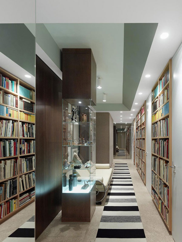 U uski hodnik smeštene su police od poda kao u muzeju ili biblioteci a velika klizna vrata, izvedena u tamnom drvetu, razdvajaju ovaj deo od prostora za spremanje hrane.