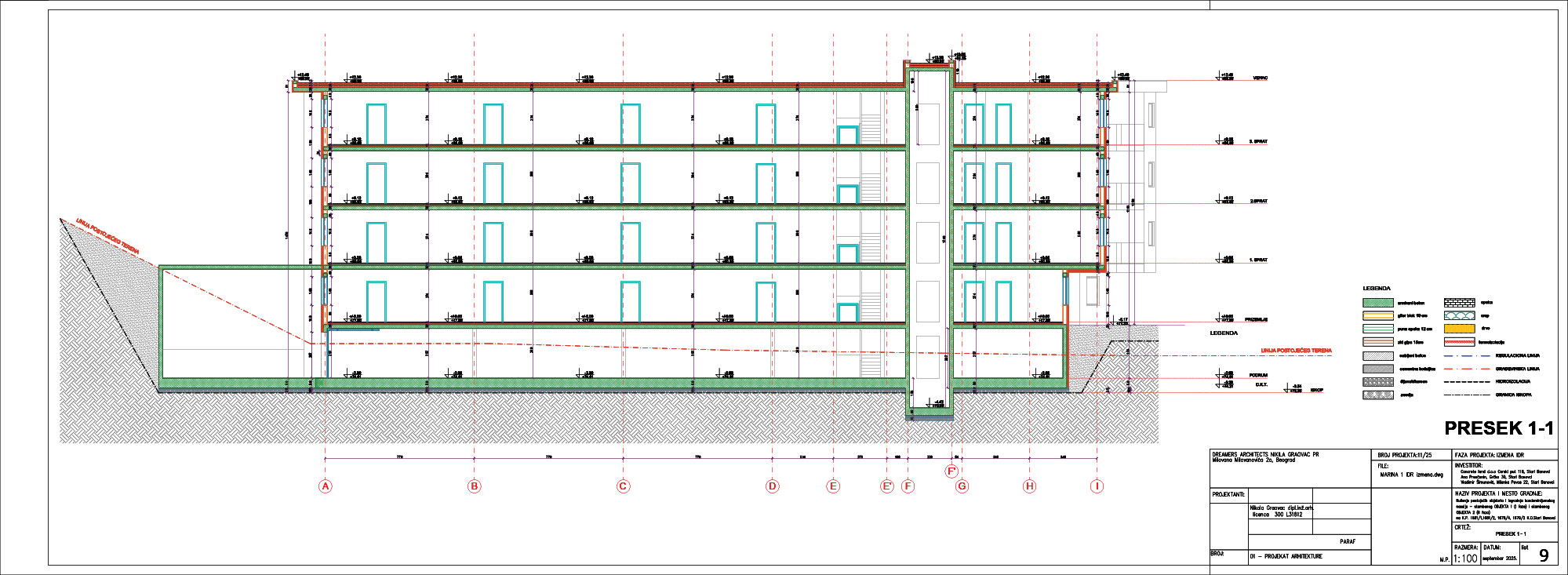 Stambeni objekat br. 1, u grafičkoj dokumentaciji označen kao Marina 1, sastoji se iz podruma – u kom su smešteni garaža sa 20 parking mesta i podrumske/tehničke prostorije i ostave, nadstrešnice silaza u garažu, prizemne i tri tipske stambene etaže.