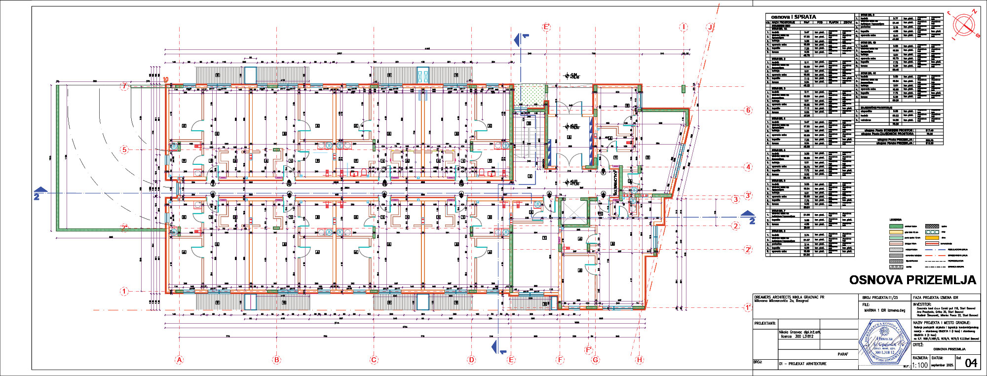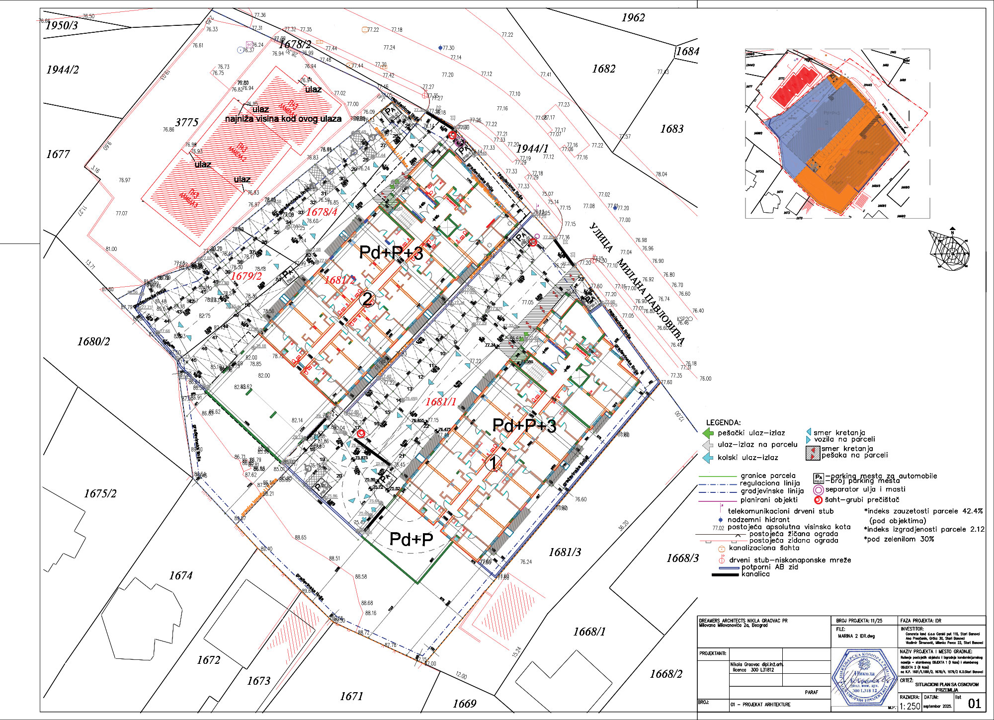 Što se tiče ostvarenih urbanističkih parametara, ukupna površina parcele iznosi 4.126 m², ukupna bruto izgrađena površina objekta br. 1 je 3.949 m², objekta br. 2 4.785 m², čime dolazimo do ukupne brute površine celog kompleksa koja iznosi 8.734 m².