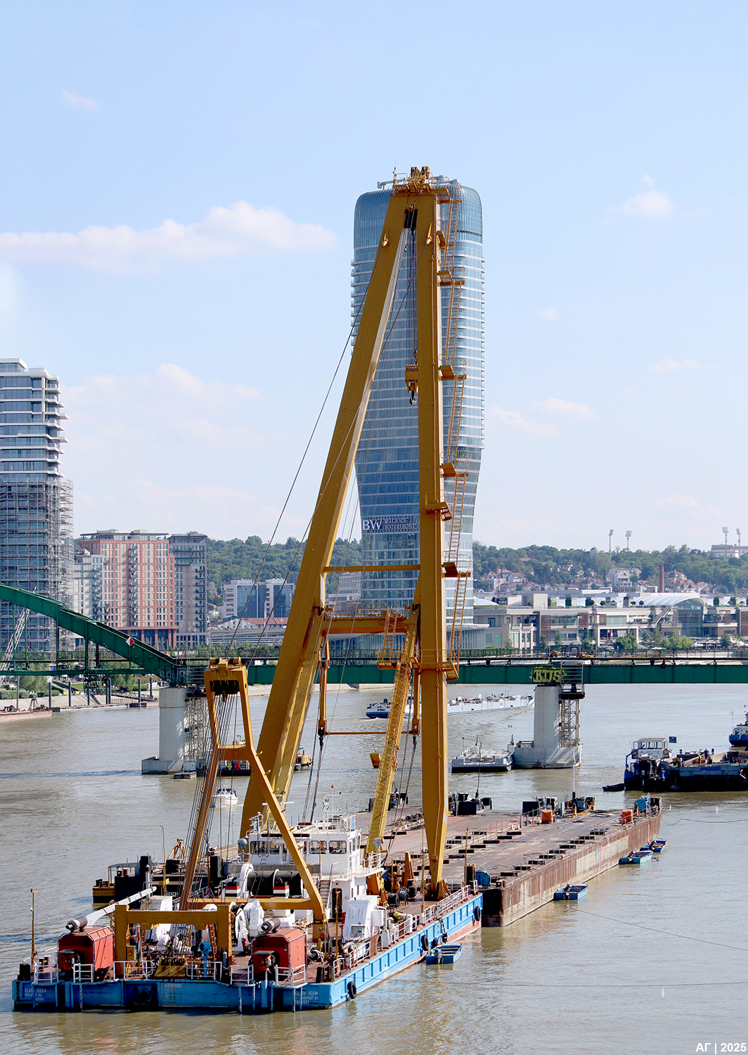 Demontažu čeličnih segmenata nad vodenom površinom, u drugom, logičnom i prirodnom, koraku, najavio je dolazak svojevrsne savske nemani – mađarske dizalice Klark Adam (Clark Ádám) sa baržama, impozantne mašinerije, vidljive iz više vizura starog i novog dela Beograda. Prvo su demontirana dva čelična segmenta sa novobeogradske strane (između stubova “1”, “2” i “3”), a potom i jedan sa starobeogradske strane (između stubova “4” i “5”).
