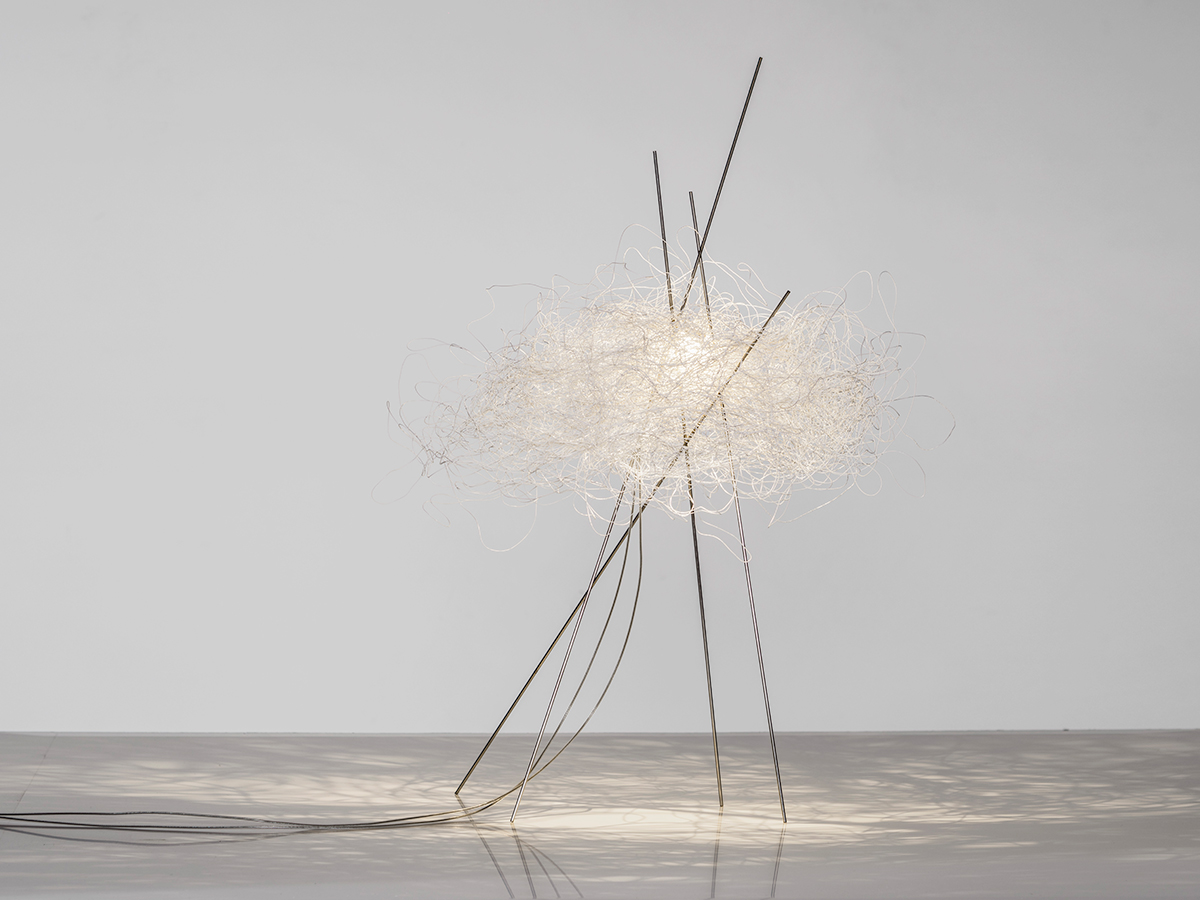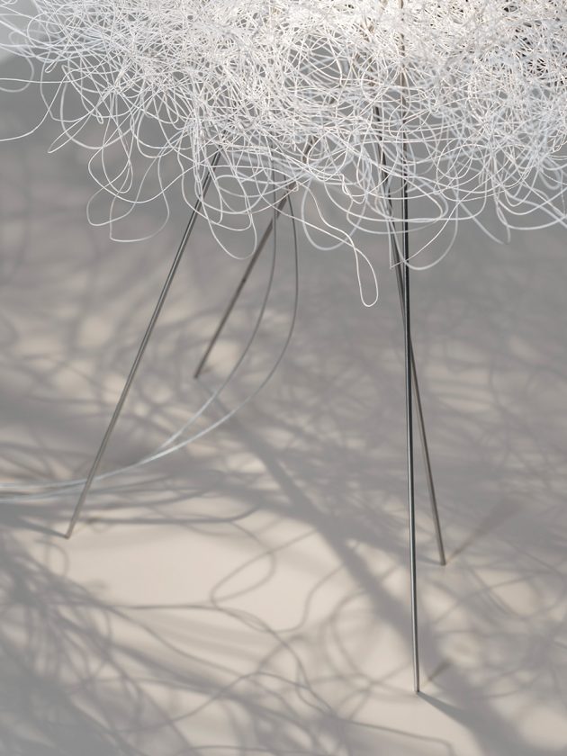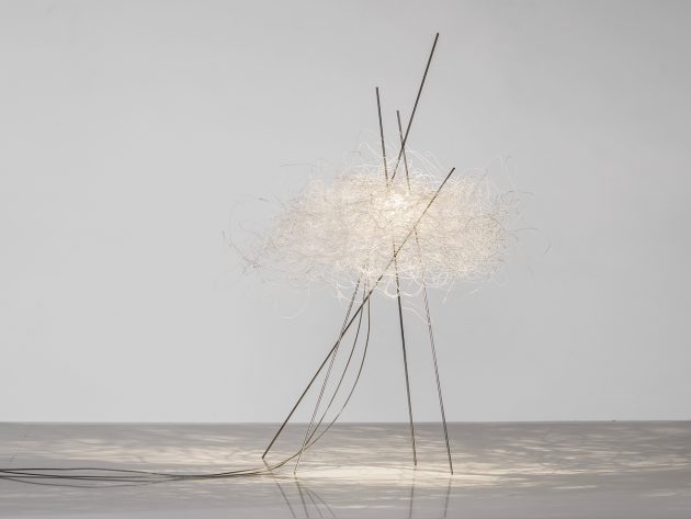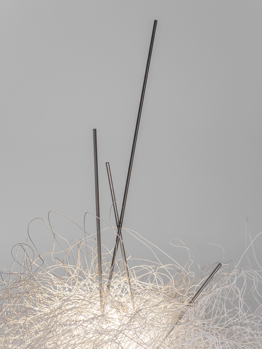 Zahvaljujući LED sijalici postavljenoj u centru ovog klupka i refleksijama koje se dešavaju na inoksiranim nitima, stvara se efekat kao da svetlost beži od lampe.