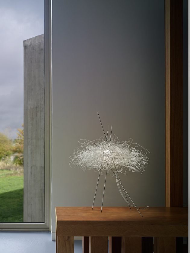 Pili je napravljen od jedne niti nerđajućeg čelika koja je isprepletena tako da se stvara nasumično oblikovani abažur.