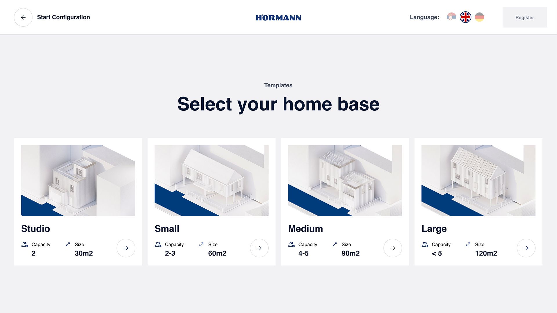Potencijalni korisnik bi selektovanjem željenih entiteta (broj stanovnika/tipologija partera/tipologija terase/tipologija krova) samostalno oformio svoju kuću iz snova koristeći proizvode kompanije Hörmann, samostalno, u samo par klikova.