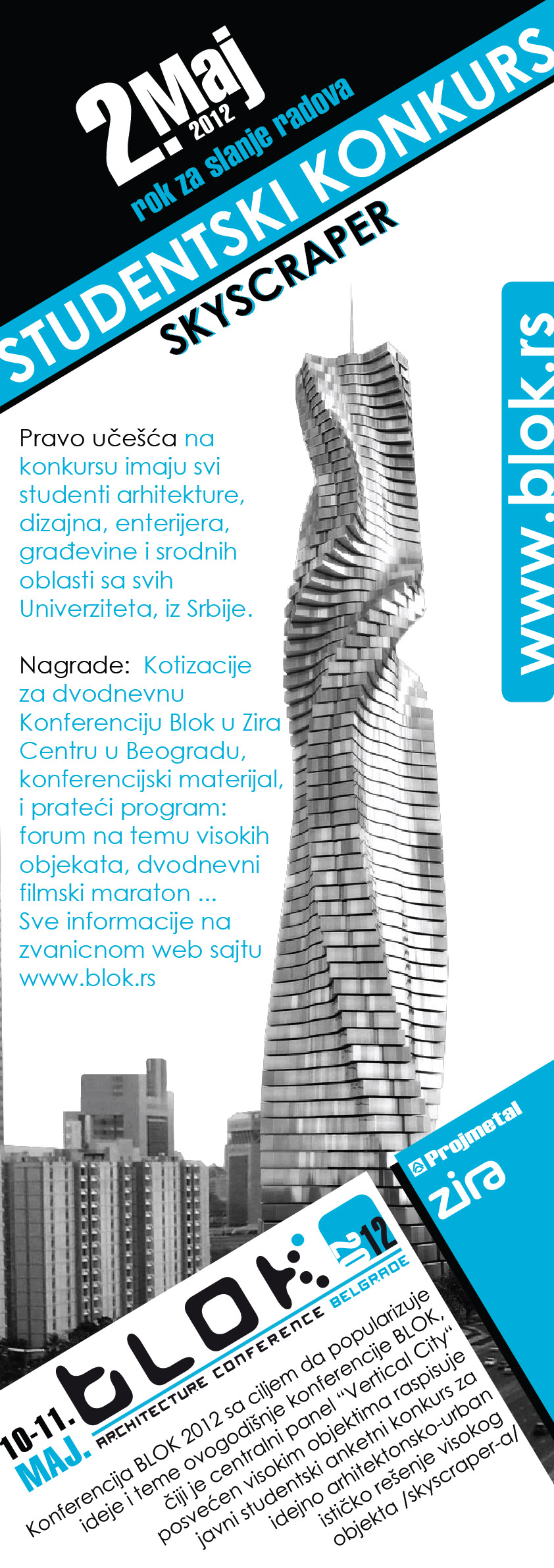 Sa ciljem da popularizuje ideje i teme ovogodišnje konferencije BLOK čiji je centralni panel “Vertical City“ posvećen visokim objektima, organizacioni tim BLOK raspisuje studentski konkurs čije nagrade su 10 kotizacija za predavanja 10. i 11. maja u ZIRA Centru u Beogradu.