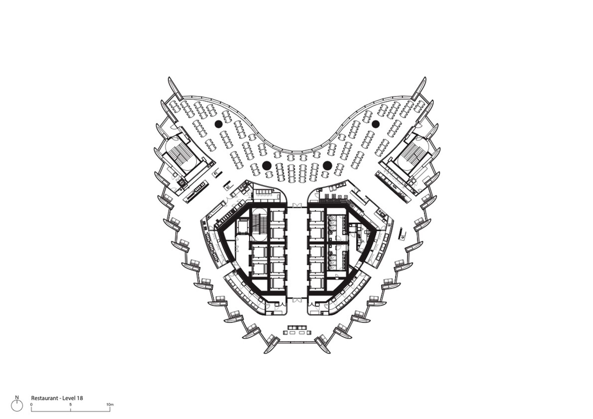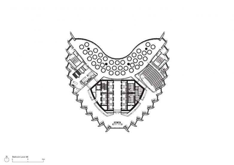 Plesna sala i auditorijum smešteni su na 38. spratu, dok je konferencijska sala trospratne visine na 48.spratu.