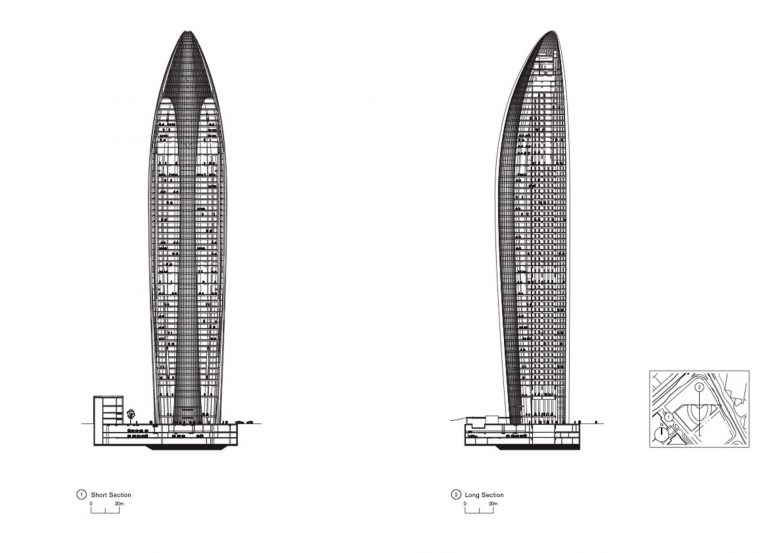 Struktura visoka 300 metara umotana je u betonska „peraja“ koja se protežu celom visinom tornja kako bi obezbedila zasenčenje za 63 sprata poslovnog prostora.